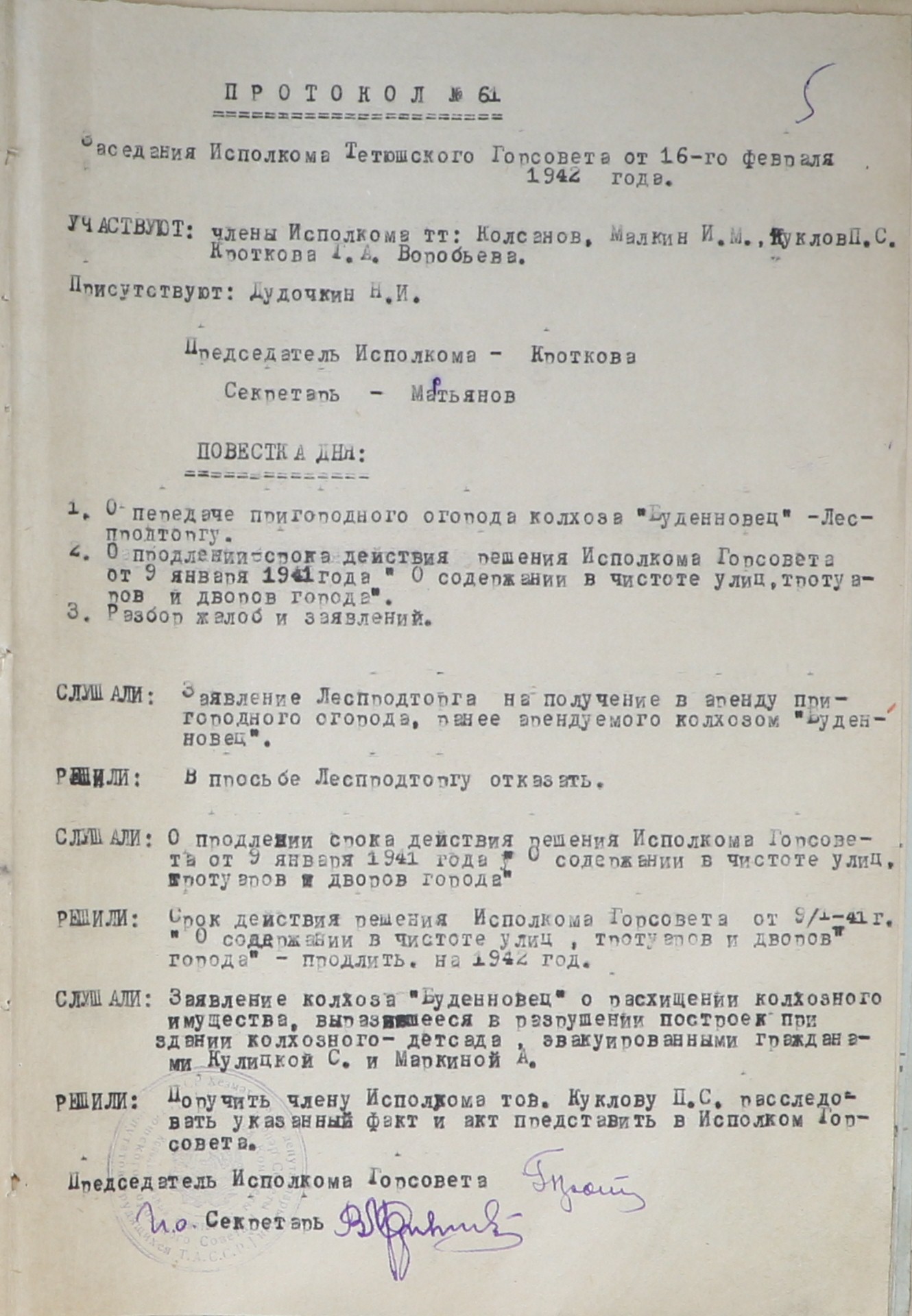 На заседании исполкома Тетюшского горсовета от 16 февраля 1942 года № 61 обсуждались следующие вопросы: «О содержании в чистоте улиц, тротуаров и дворов города».