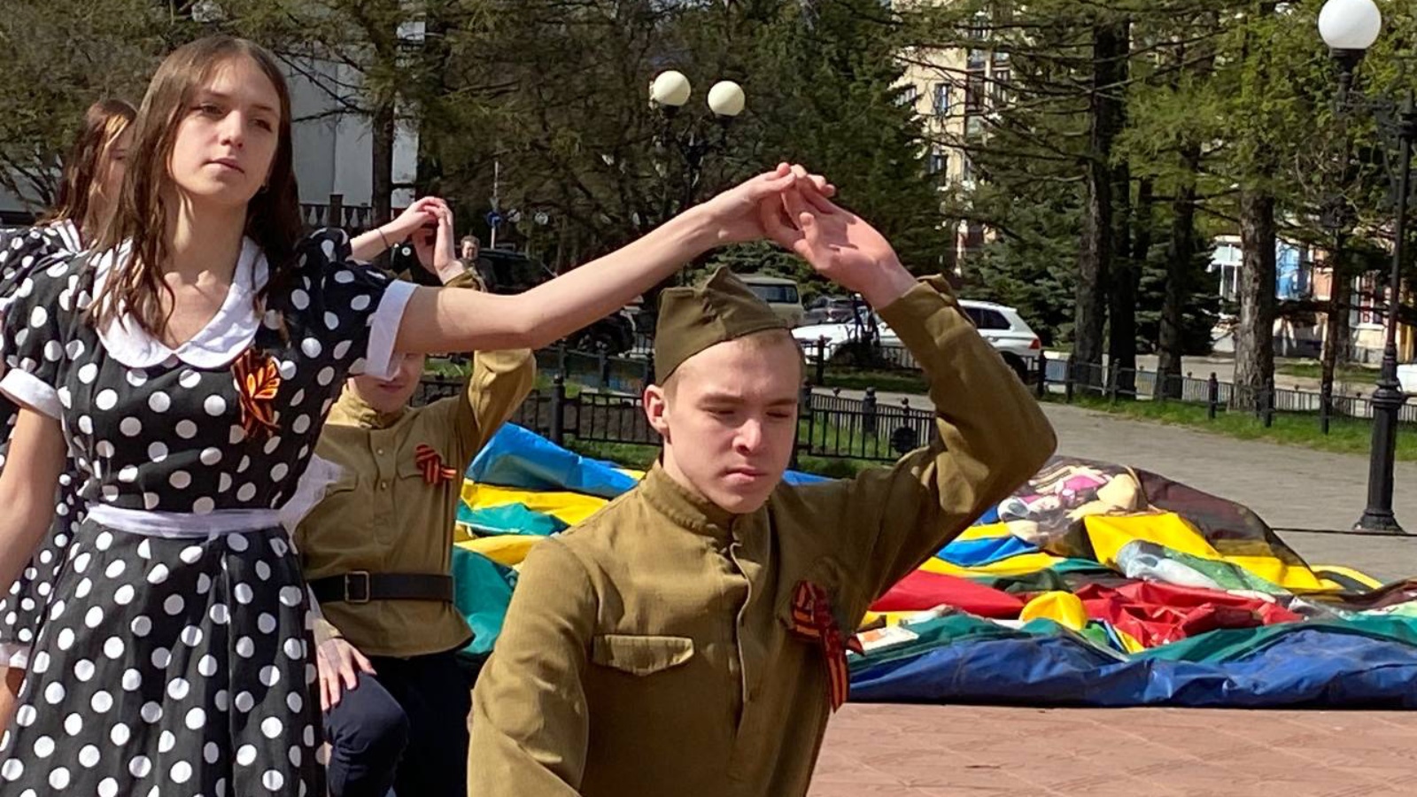 Зрители, которые наблюдали за происходящим, на несколько минут окунулись в праздничную атмосферу победного мая 1945 года. Более 20-ти пар в одежде того времени вальсировали под композицию "Ах, эти тучи в голубом" и песен военных лет