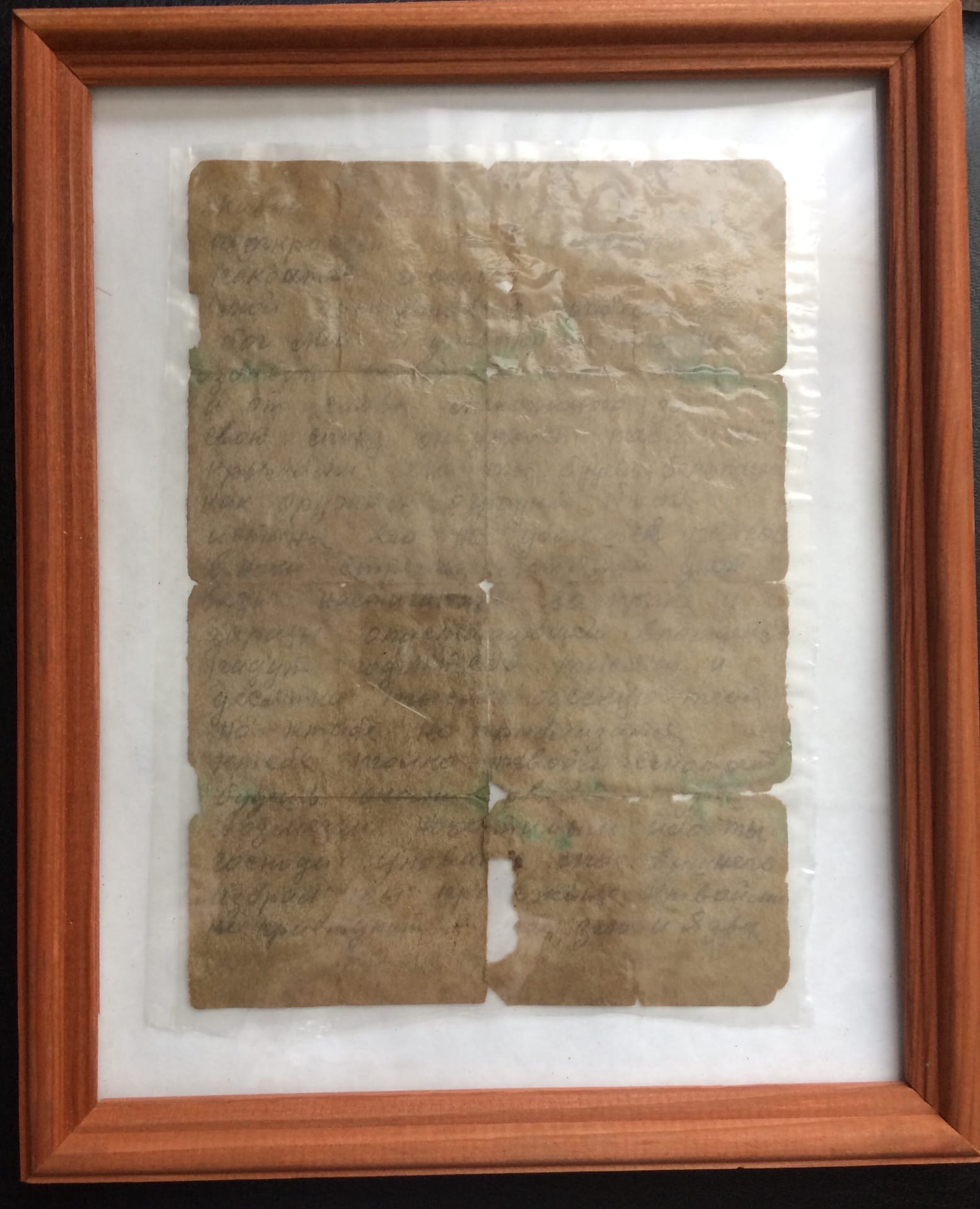 Молитва была найдена в одном из раскопов, где обрели вечный покой несколько солдат. Текст написан аккуратным почерком, скорее всего его написала мать или бабушка солдата. К сожалению, Молитва не уберегла бойца, он так и остался пропавшим без вести под Волгоградом. Удивительно, но с каждым годом, буквы этой Молитвы становятся ярче и отчетливее...