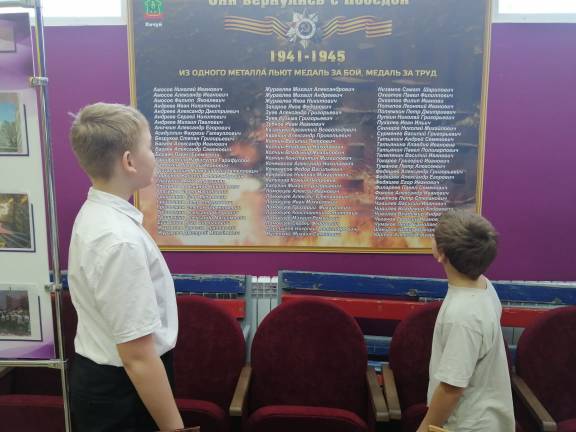 В Кичуйском сельском доме культуры рассказали ребятам о том, какими дорогами жестокой войны пришлось пройти нашим землякам, в каких боях они участвовали, какие подвиги совершали. Показали альбомы с фотографиями, наградами. Ребята с интересом смотрели, читали, искали в книге Памяти фамилии своих прадедов. В завершении почтили память воинов - земляков минутой молчания.