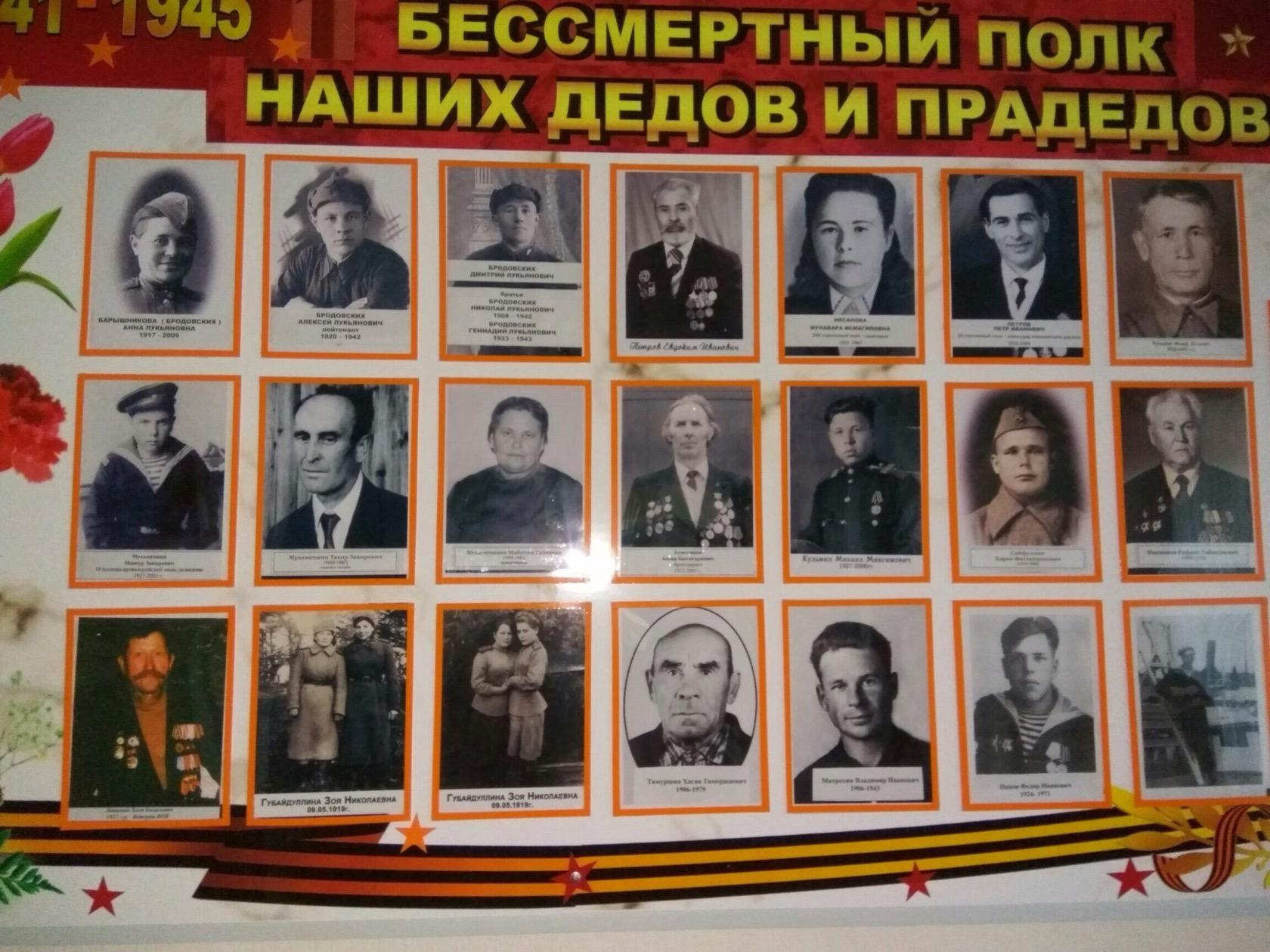 В знак памяти ушедших на фронт и ко Дню празднования 72-ой годовщины Великой Победы, по инициативе местного художника Мухаметшина Камиля Мансуровича в Районном Доме культуры был оформлен стенд «Бессмертный полк наших дедов и прадедов». На фотографиях изображены лица близких людей, тех, кто не вернулся с полей сражений и тех, кто встретил победный май 1945 года, кто героическим трудом ковал Победу.