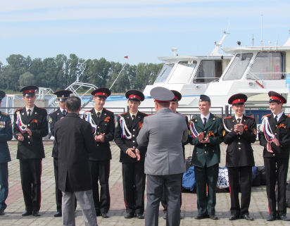 На берегу ветеранов встречали кадеты из Казанской кадетской школы, которые выстроились в шеренгу.