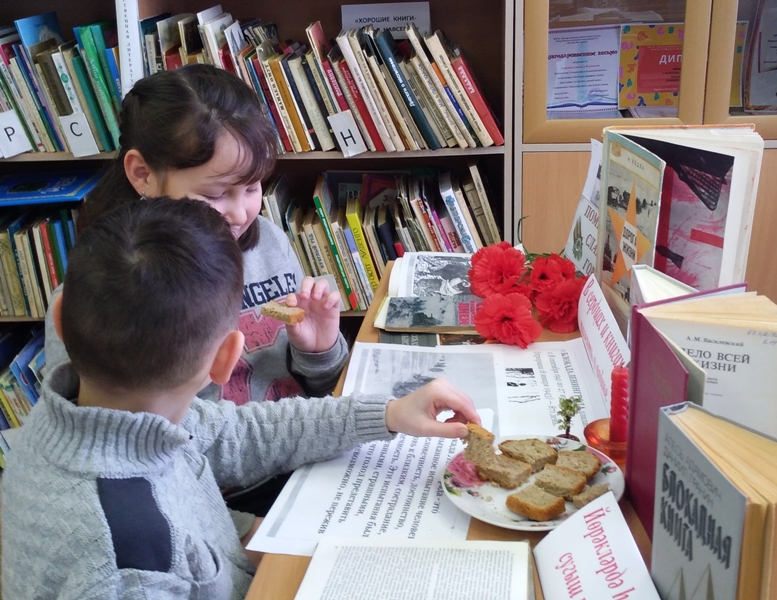 В рамках акции в библиотеке была оформлена книжная выставка и проведен обзор «В сердцах и книгах память о войне», рассказывающий о патриотизме, мужестве и стойкости защитников блокадного города. Прочитали отрывки из книг С.Алексеева «Орлович-Воронович». Знакомство с выставкой продолжалась в течение дня. Участники мероприятия узнали о том, как выстоял блокадный город, что пришлось пережить мужественным ленинградцем, взрослым и детям, живущим в условиях полного окружения врагами, без воды и еды, без тепла и света, но с надеждой и верой в победу. Узнали, что такое «Дорога жизни», познакомились с трагическим дневником Тани Савичевой. Мы всегда будем помнить силу героев, х стойкость и бесконечную любовь к Родине и никогда их не забудем! Всем участникам акции раздавали кусочки « блокадного хлеба».