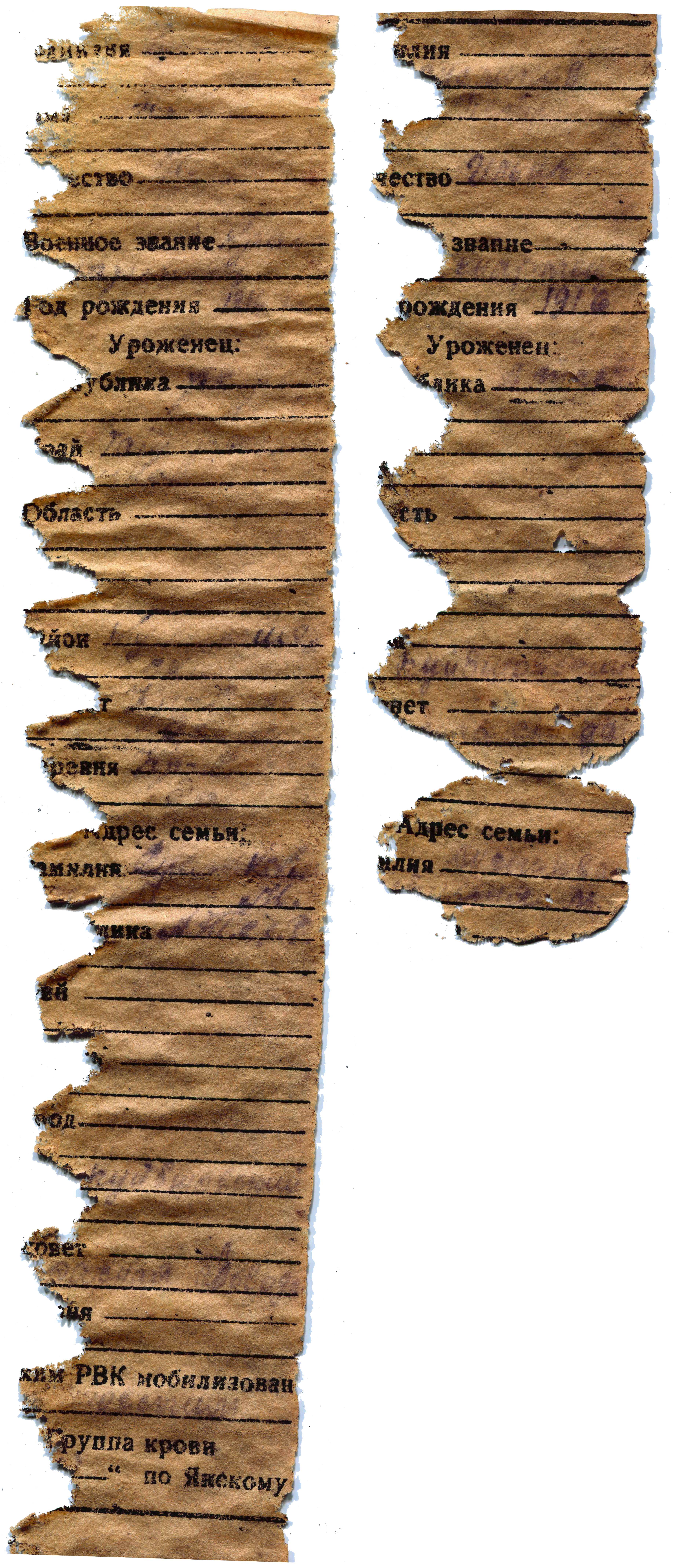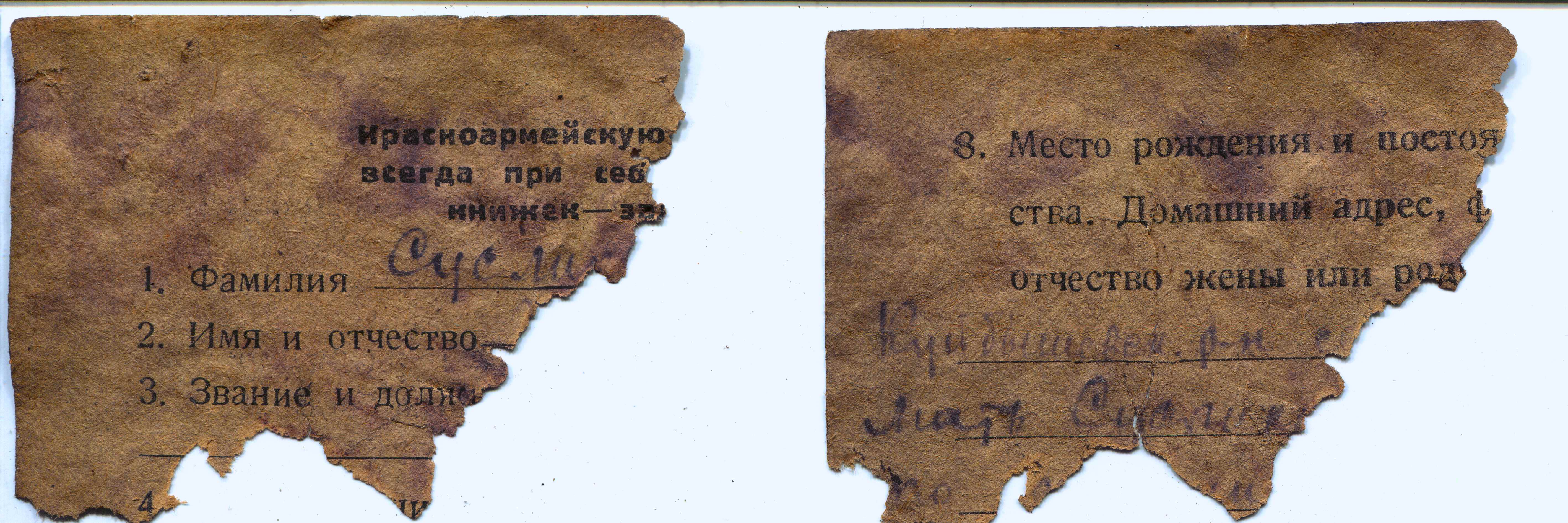 В ходе плановых поисковых работ на местах боев Великой Отечественной войны у хутора Плесистовский Суровикинского района Волгоградской области поисковым отрядом «Донской рубеж» г.Суровикино (руководитель Кауркин Дмитрий Георгиевич, тел. 89053927426 , e-mail: kaurkindmitriy67@mail.ru) были найдены непогребенные останки советского воина. Из сохранившихся записей в найденных при останках смертном медальоне и красноармейской книжке удалось прочитать:
