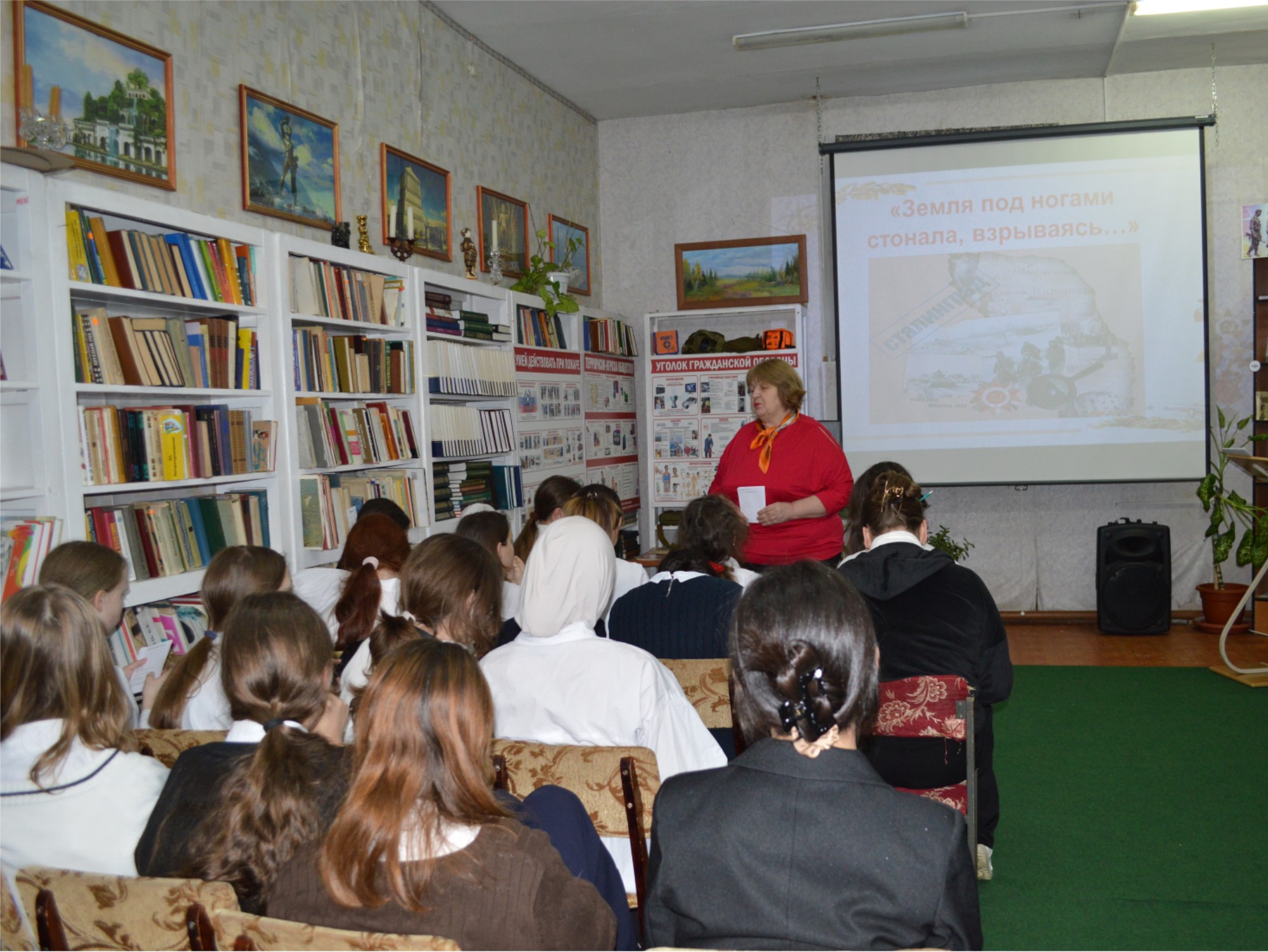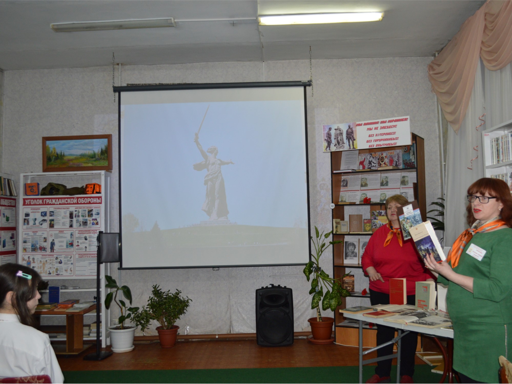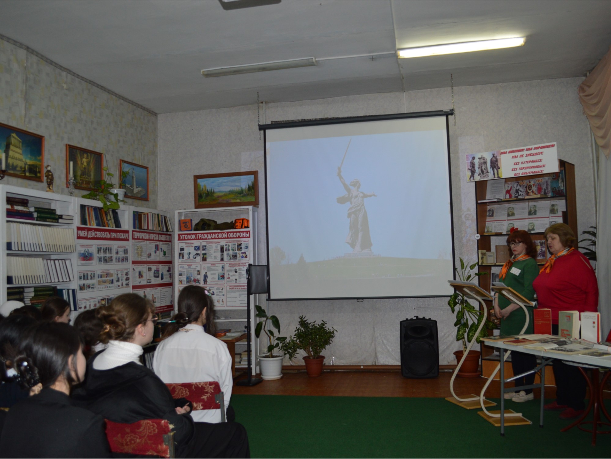 В библиотеке-филиале №2 г. Бугульма провели вечер исторической памяти «Земля под ногами стонала, взрываясь…», посвященный Сталинградской битве – одного из наиболее крупнейших сражений в ходе Великой Отечественной войны между советскими войсками с одной стороны и войсками Третьего рейха, Румынии, Италии, Венгрии с другой. Участникам мероприятия были представлены кадры видеохроники исторического кровопролитного поединка. Ведущие зачитали отрывки из писем участников боёв. Звучали фрагменты стихов поэтов-фронтовиков и рассказ о грандиозном скульптурном ансамбле на Мамаевом кургане, установленном в честь подвига участников битвы.