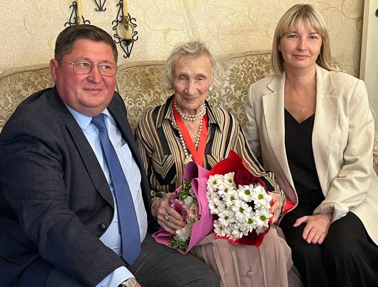 От имени Президента Российской Федерации Владимира Путина и мэра города Наиля Магдеева юбиляра поздравили и.о. главы администрации Автозаводского района Айрат Хуснуллин и представитель депутата Городского Совета Эдуарда Панфилова.