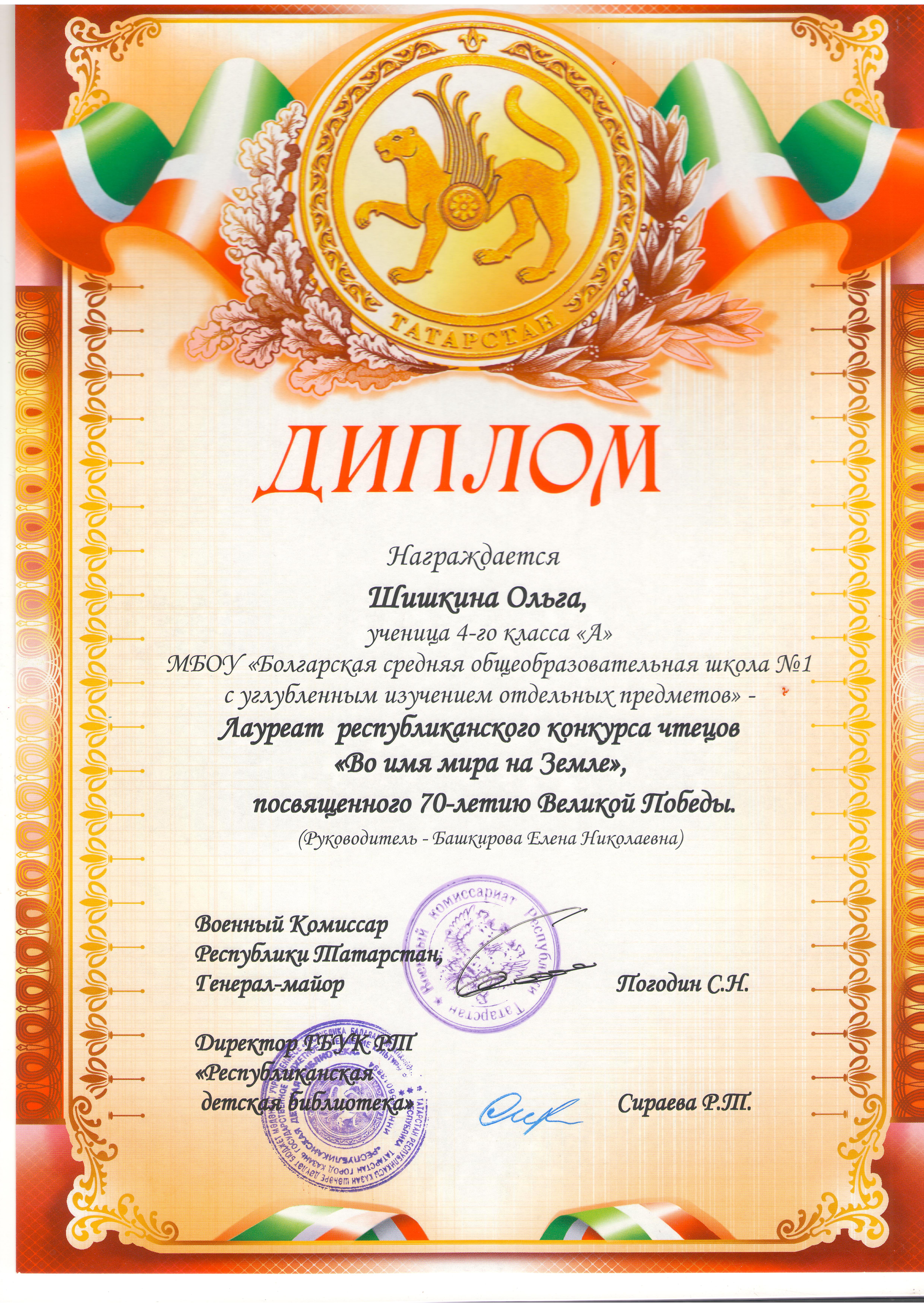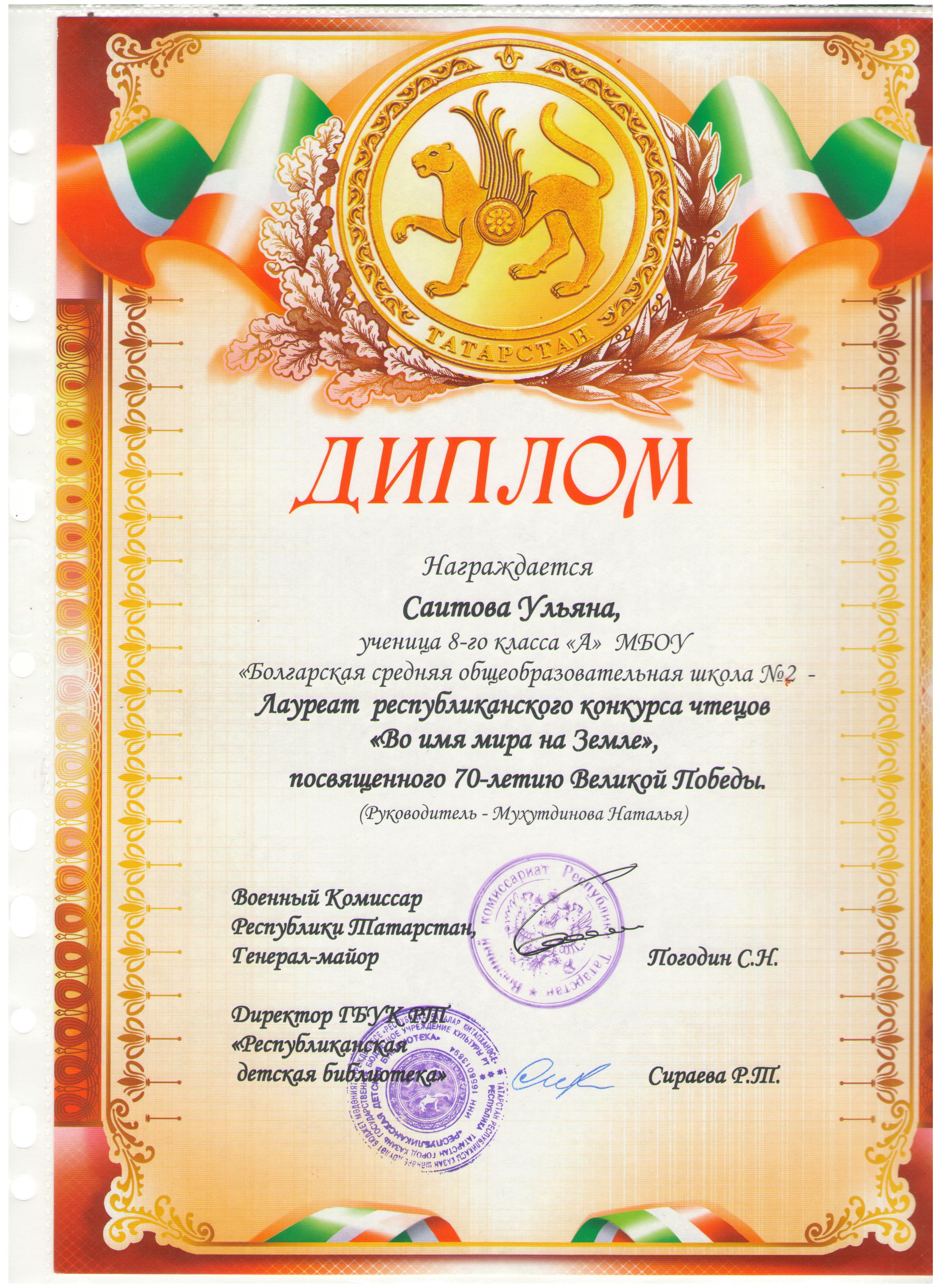 Республиканский конкурс чтецов «Во имя мира на Земле», посвященный 70-летию Великой Победы в ВОВ, проводился с 1 декабря 2014 года по 1 мая 2015 года. Организаторами конкурса были - Республиканская детская библиотека РТ и Военный Комиссариат РТ. В рамках Конкурса участникам предлагалось прочитать вслух стихотворение или отрывок из выбранного ими прозаического произведения, которое не входит в школьную программу по литературе, рассказывающего о героизме советских людей на фронте и тылу, о детях во время войны.