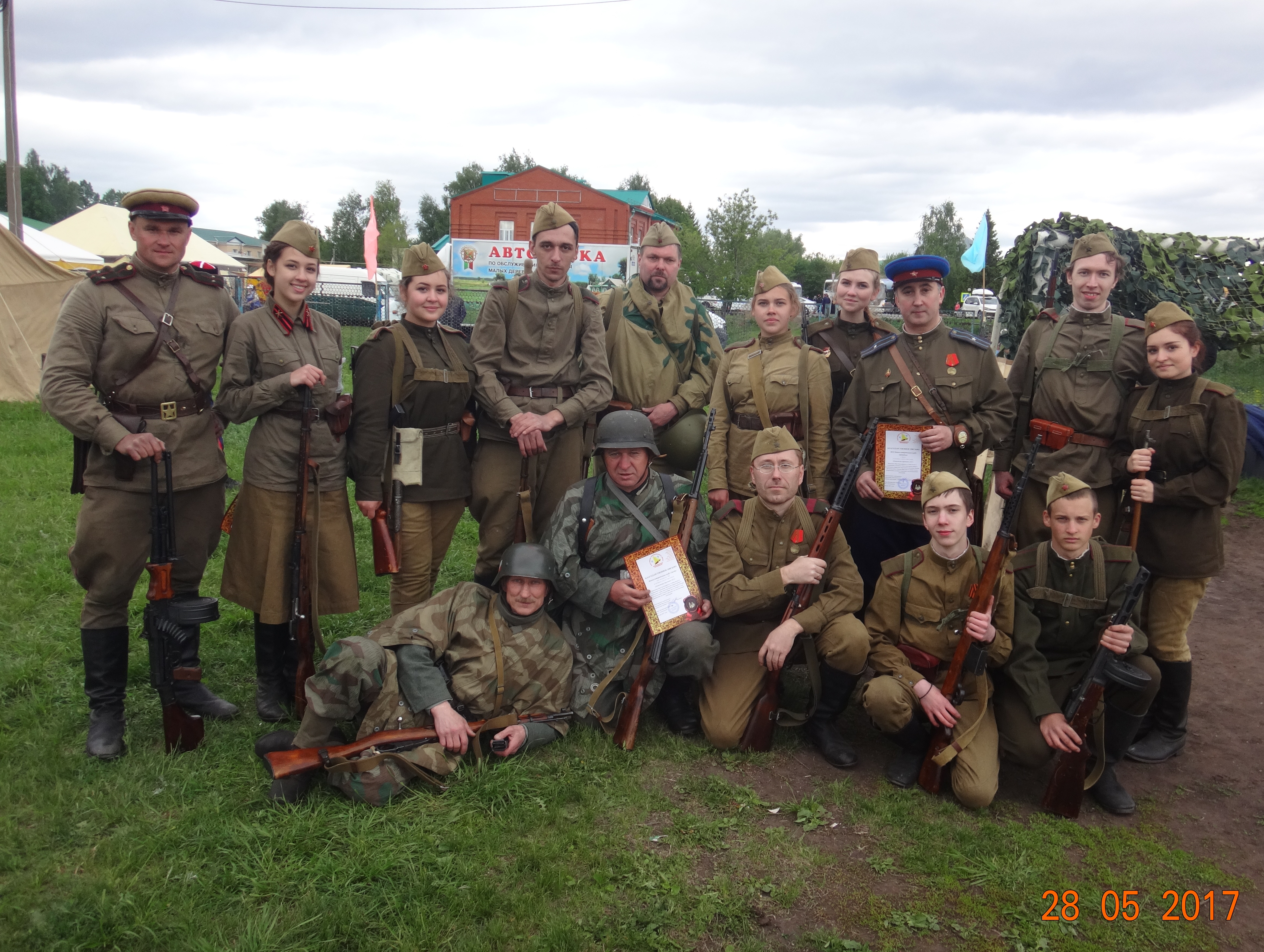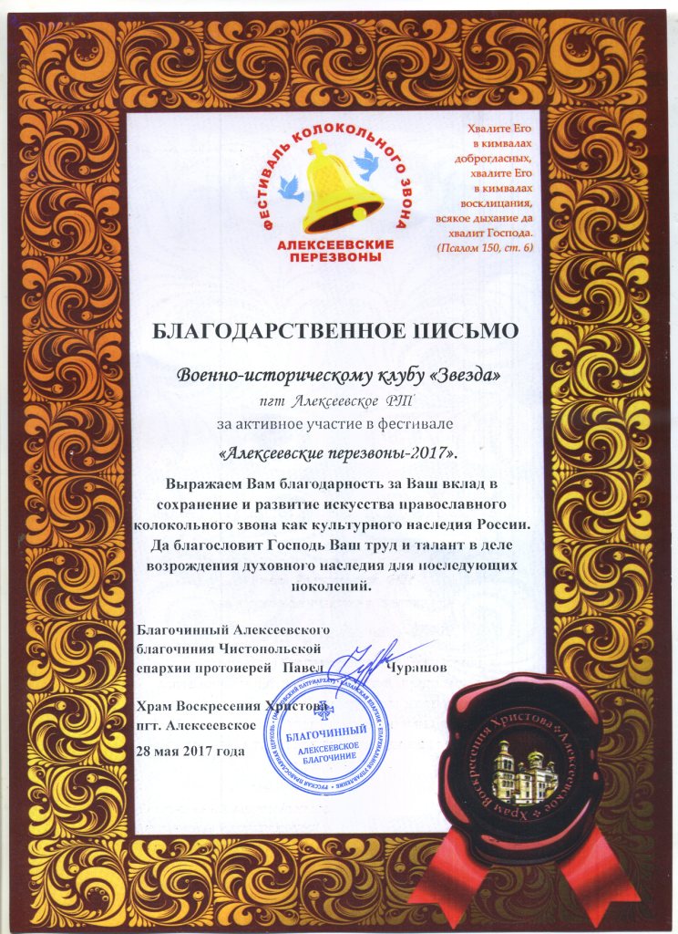 Вчера 28 мая 2017 г. в п. Алексеевском состоялся 15-й фестиваль колокольного звона "Алексеевские перезвоны". На фестиваль были приглашены в числе многих гостей энтузиасты военной реконструкции из городов Самара, Димитровград, Ульяновск, Тольятти (показывали тему Гражданской войны), Казань (ВИК "Цитадель" и ВИК "Витязь"), Чистополь (ВППО "Выстрел"), а также ВИК "Звезда", которые разыграли сцену боя между Вермахтом и Красной Армией. Все клубы-участники были награждены благодарственными письмами от лица организаторов фестиваля. Особую благодарность хочется выразить клубу "Витязь" под руководством В. Хабарова, котрый принял участие в реконструкции на общественных началах без возмещения собственных затрат.
