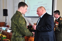 Еще одна добрая традиция военно-патриотической конференции - награждение офицеров и курсантов ИВО. Приказом Министра обороны Российской Федерации С.К.Шойгу от 10.02.2016 "о поощрении личного состава Вооруженных сил Российской Федерации" была объявлена благодарность полковникам Х.Г.Тухбиеву и А.В.Югову.