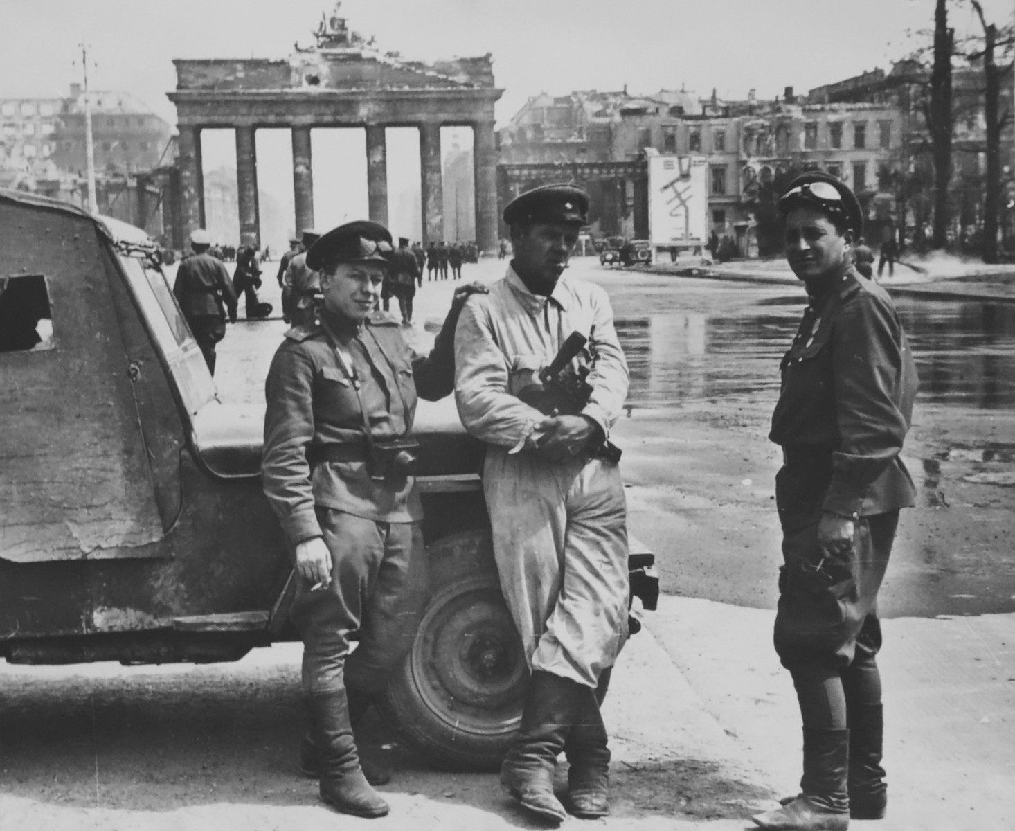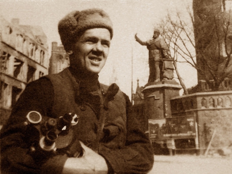 «Утро… Раннее утро 1 мая. Развеялись дым и пыль ночного боя. Вот оно, поле страшной битвы. Майский ветерок шевельнёт иногда локон чьих-то волос, угол солдатской шинели, расстегнет ворот гимнастёрки. Навожу аппарат на рейхстаг. Хорошо видны широкие каменные ступени, тяжёлые входные двери между колоннами. Взгляд невольно скользит по стенам и колоннам вверх.