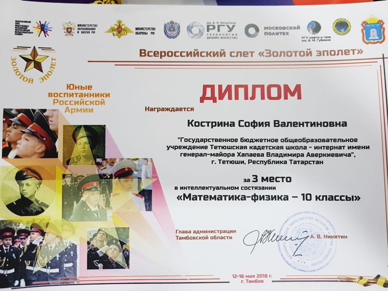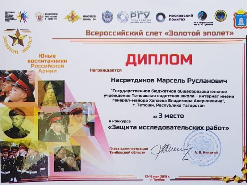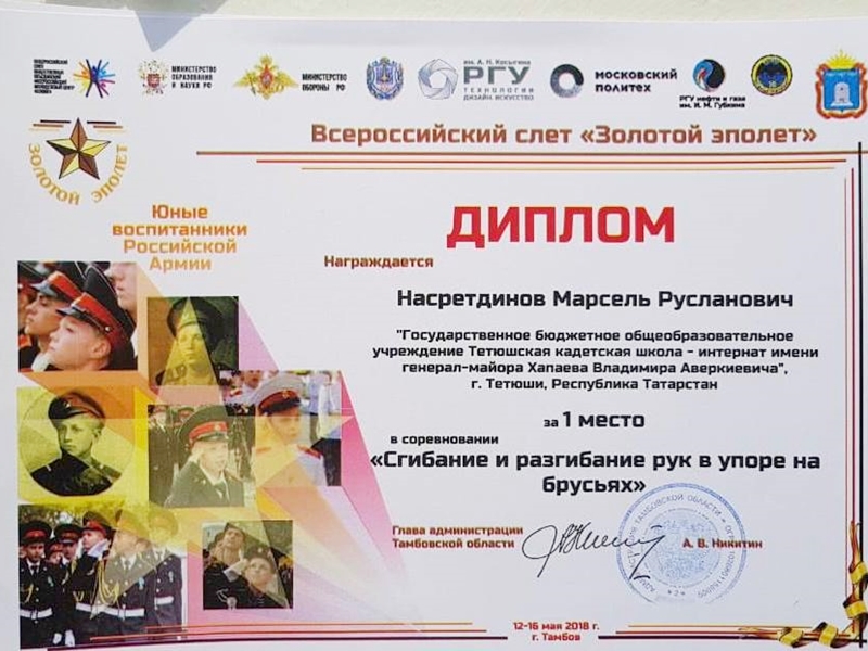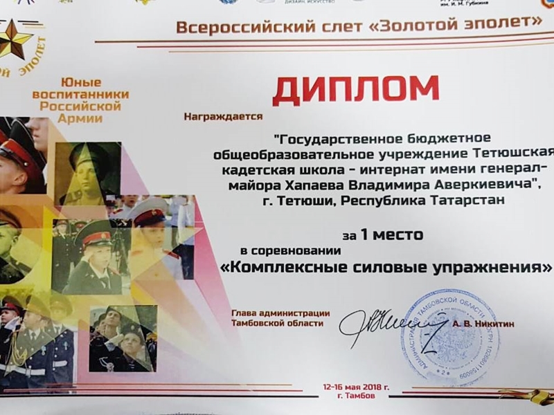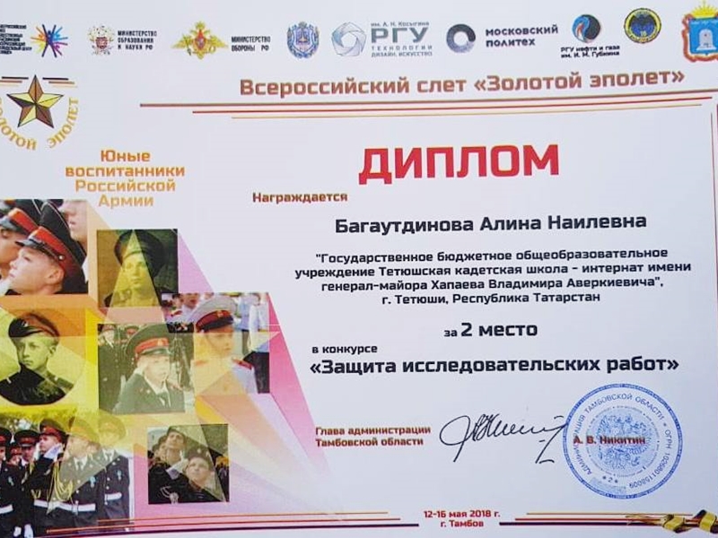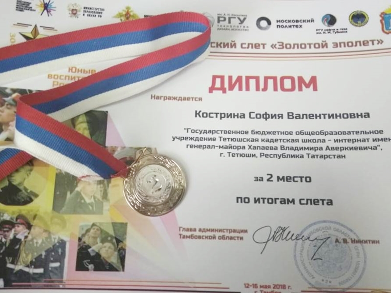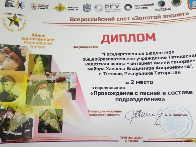 По итогам Всероссийского слёта «Золотой эполет», команда ГБОУ «Тетюшская кадетская школа-интернат» под руководством офицера-воспитателя Н.В. Загфарова заняла 2 место в общекомандном зачёте, и достигли значительных результатов в номинациях: