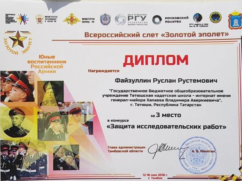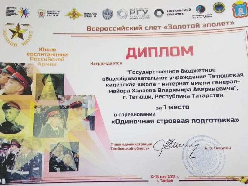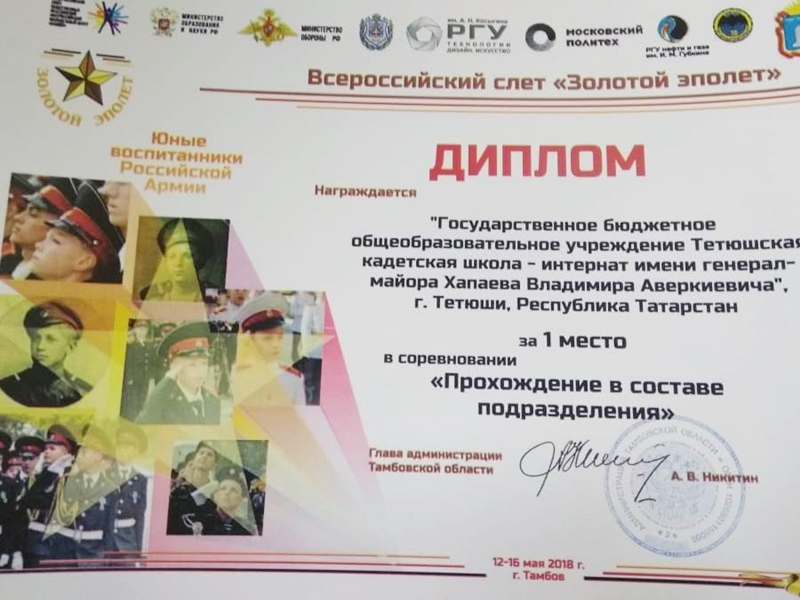 С 12 по 16 мая 2018 года в г. Тамбове проводился ВСЕРОССИЙСКИЙ КАДЕТСКИЙ СЛЕТ «ЗОЛОТОЙ ЭПОЛЕТ», посвященный юным воспитанникам Российской Армии. Всероссийский кадетский слет «Золотой эполет» собрал 200 ребят в погонах: здесь и Самарская область, и Тверская, и даже далекий Мурманск. Республику Татарстан представляла команда ГБОУ «Тетюшская кадетская школа-интернат».