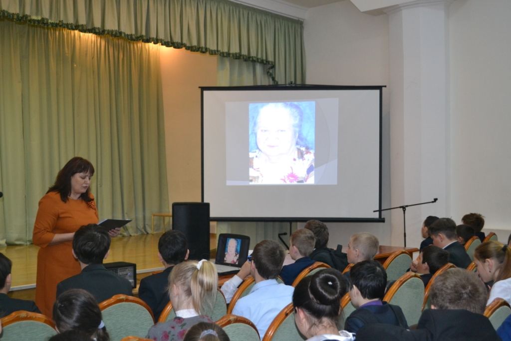 Ей было 12 лет, когда угнали в Германию. Это было 11 апреля 1942 года. Жила она в селе Темошевка Михайловского района Запорожской области. Освободили их только в 1945 году. На сегодняшний день она проживает с детьми. Детям была зачитана воспоминания Маренковой Е.Н. о тех годах, проведенных в плену. В конце урока минутой молчания упомянули всех погибших, измученных в лагерях смерти.