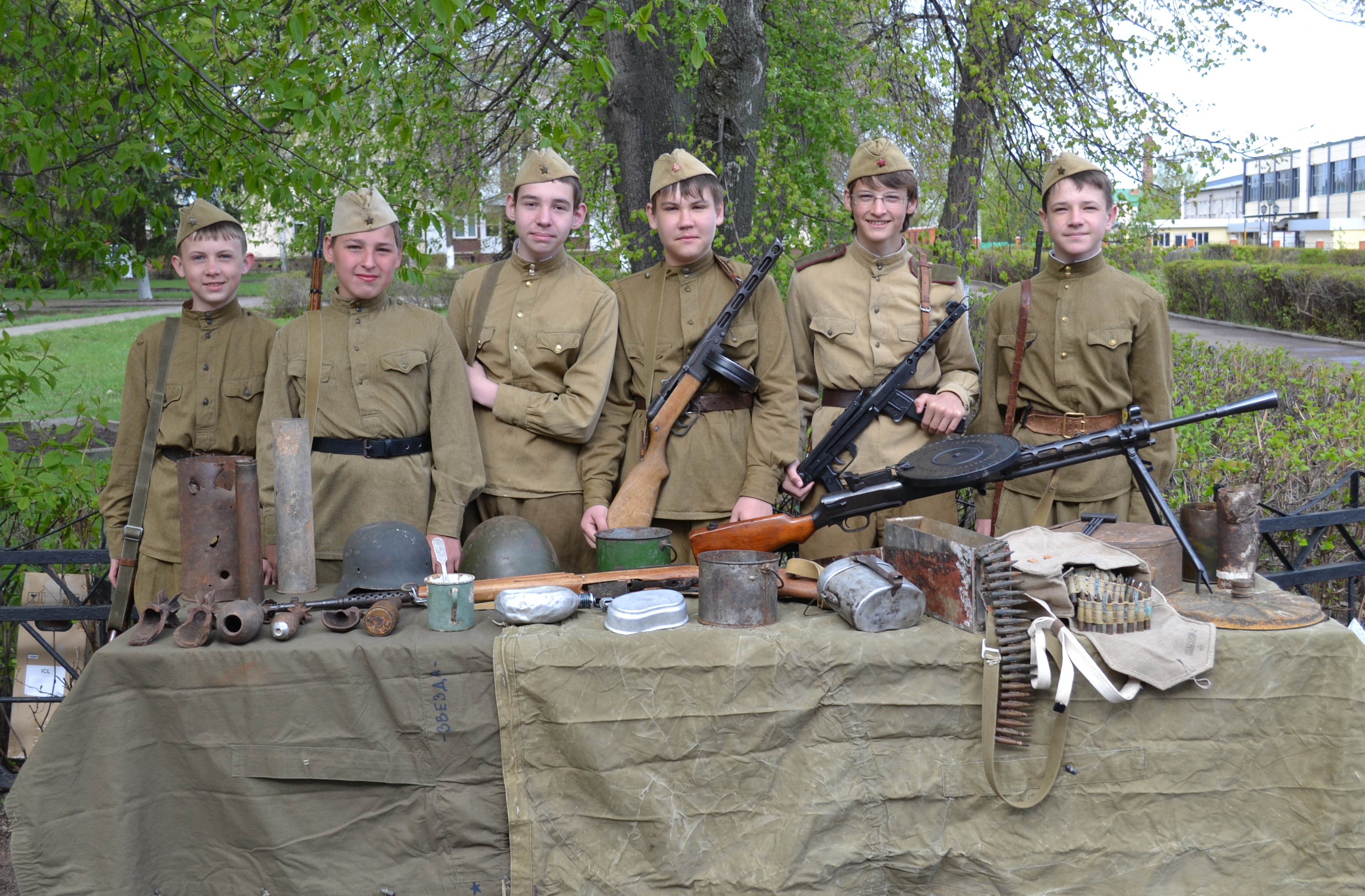 В праздник Дня Победы военно-исторический клуб "Звезда" организовал интерактивную выставку по Великой Отечественной войне. Любой желающий, пришедший 9 мая к Вечному огню, имел возвожность прикоснуться к подлинным предметам пеиода войны: оружие, боеприпасы, военное снаряжение. выставку представляли молодые участники клуба, учащиеся 6-7 классов школы №1, в форме красноармейцев образца 1943 года: Сидоров Миша, Чурашов Егор, Козонков Андрей, Вержаков Максим, Сарбаев Никита, Калмыков Илья.