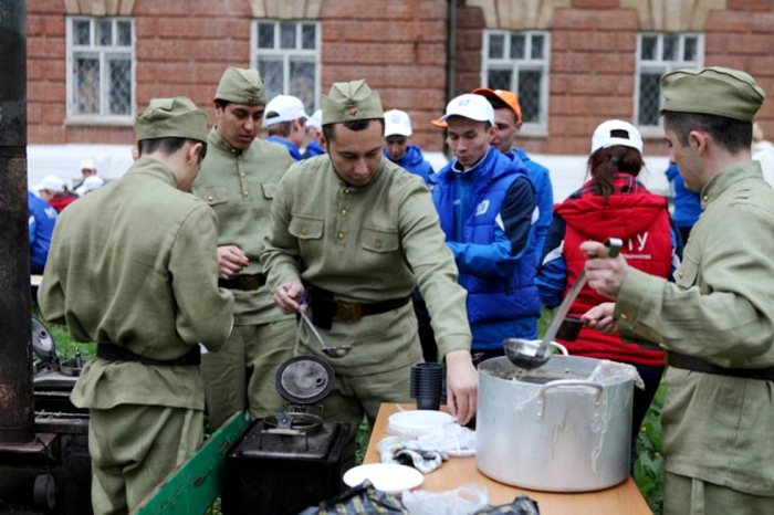 В это время для гостей и приглашенных на Университетской площади Елабужского института КФУ развернулся настоящий праздник: с хореографическими и вокальными номерами выступали творческие коллективы вуза, а в саду у института расположилась полевая кухня, здесь готовили угощение для гостей праздника – солдатскую кашу.
