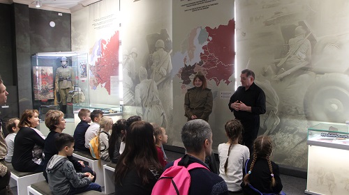 В самом начале экскурсии перед детьми выступил сотрудник Музея М.В. Черепанов, председатель Ассоциации "Клуб Воинской Славы". В ходе диалога с детьми он выяснил, что известно школьникам о Великой Отечественной войне, причинах начала войны, отдельных этапах войны, итогов Великой Отечественной и Второй мировой войны.