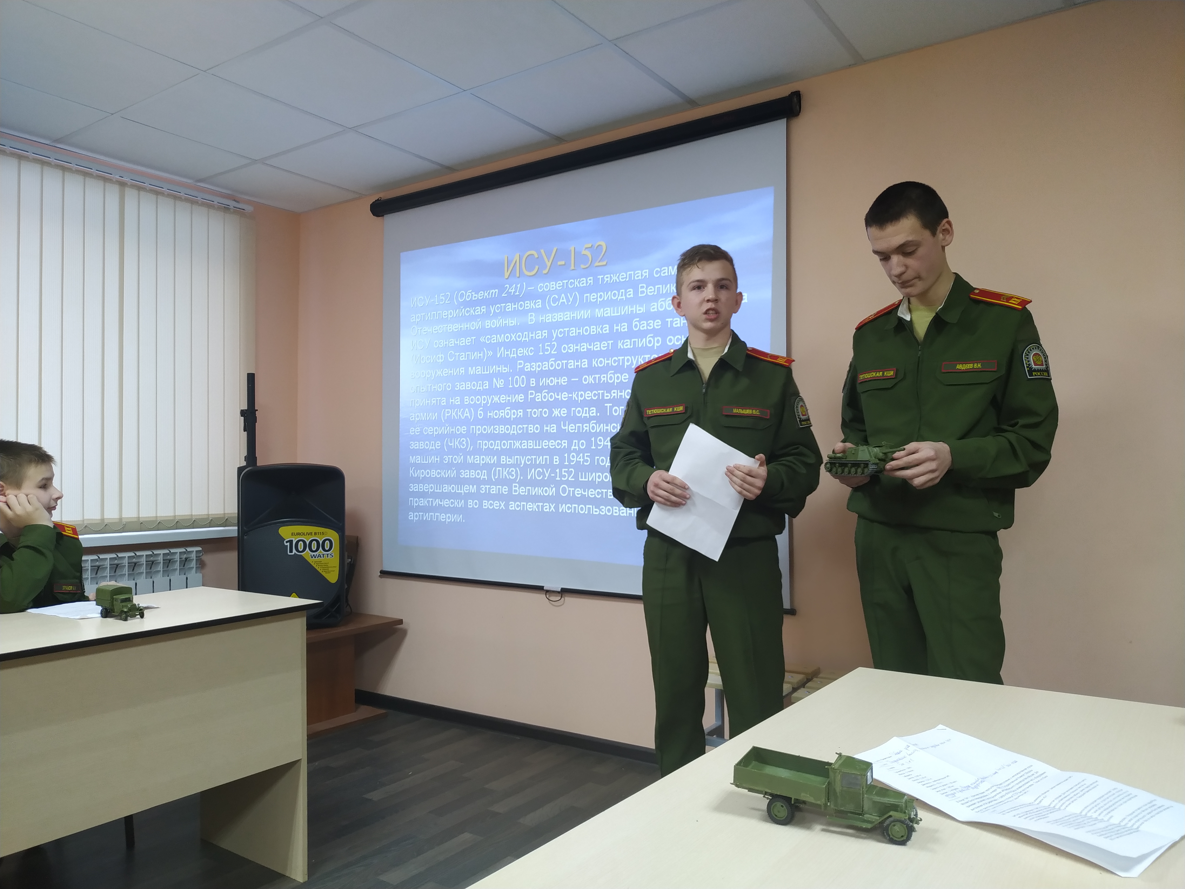 С целью совершенствования патриотического воспитания, сохранения исторической памяти, уважения к предкам и гордости за их воинские подвиги и приобщения кадет к исследовательской деятельности по изучению истории Отечества и использованию инновационных технологий для отражения исторических событий периода Великой Отечественной войны (1941-1945 гг.) с 3 по 13 февраля в Тетюшской кадетской школе-интернате проходил конкурс моделей военной техники и транспортных средств, посвященного 75-летию Победы в Великой Отечественной войне на приз начальника автошколы ДОСААФ ТМР РТ Колсанова А.Г.