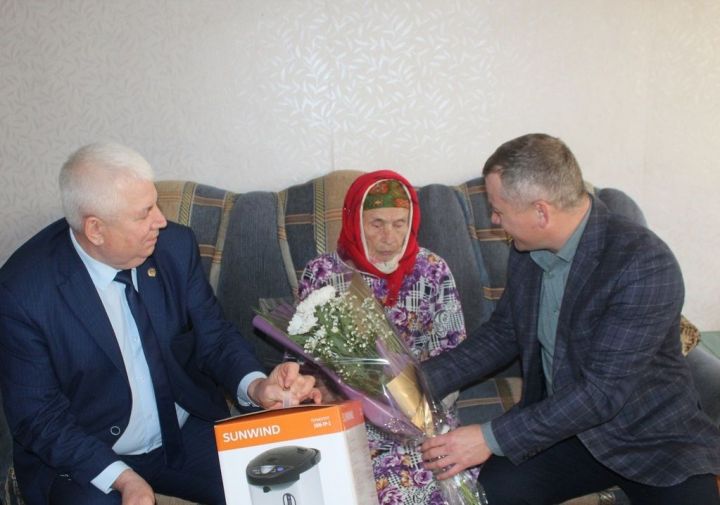 Алексей Ярухин и Рамиль Низамов вручили юбилярше персональное поздравление от Президента России Владимира Путина, памятный подарок от имени главы района Марата Гафарова и цветы. Гости пожелали юбилярше долголетия и крепкого здоровья.