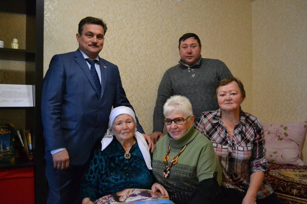 Пришел в день юбилея поздравить бабушку Газизу Глава Верхнеуслонского муниципального района Марат Зиатдинов, открытку от президента Владимира Путина вручил, от района подарок вручил, добрые, теплые слова нашел. Да и глава Шеланговского сельского поселения Валерий Майоров привет от земляков передал и подарок вручил.
