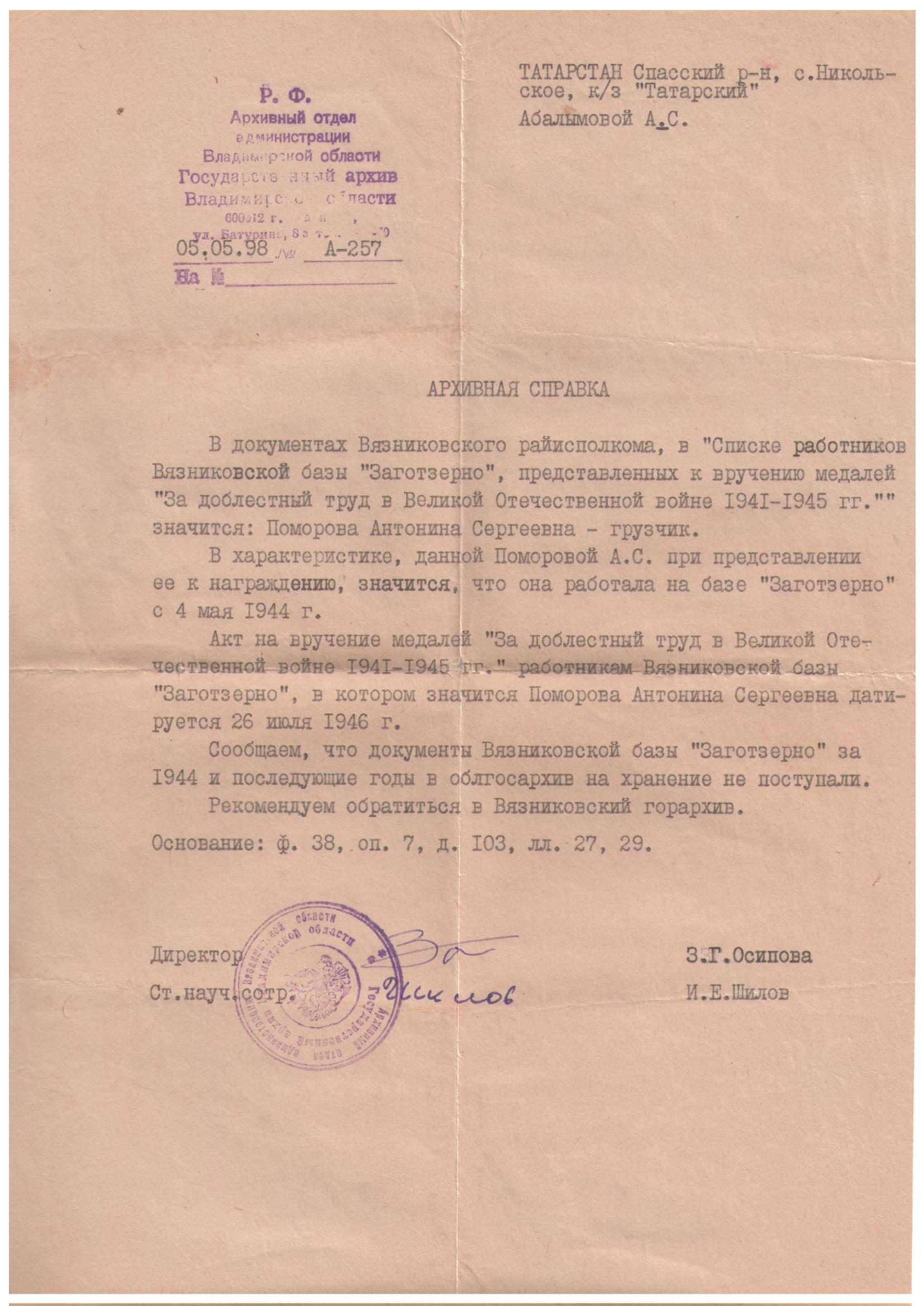 АБАЛЫМОВА (ПОМАРОВА) АНТОНИНА СЕРГЕЕВНА