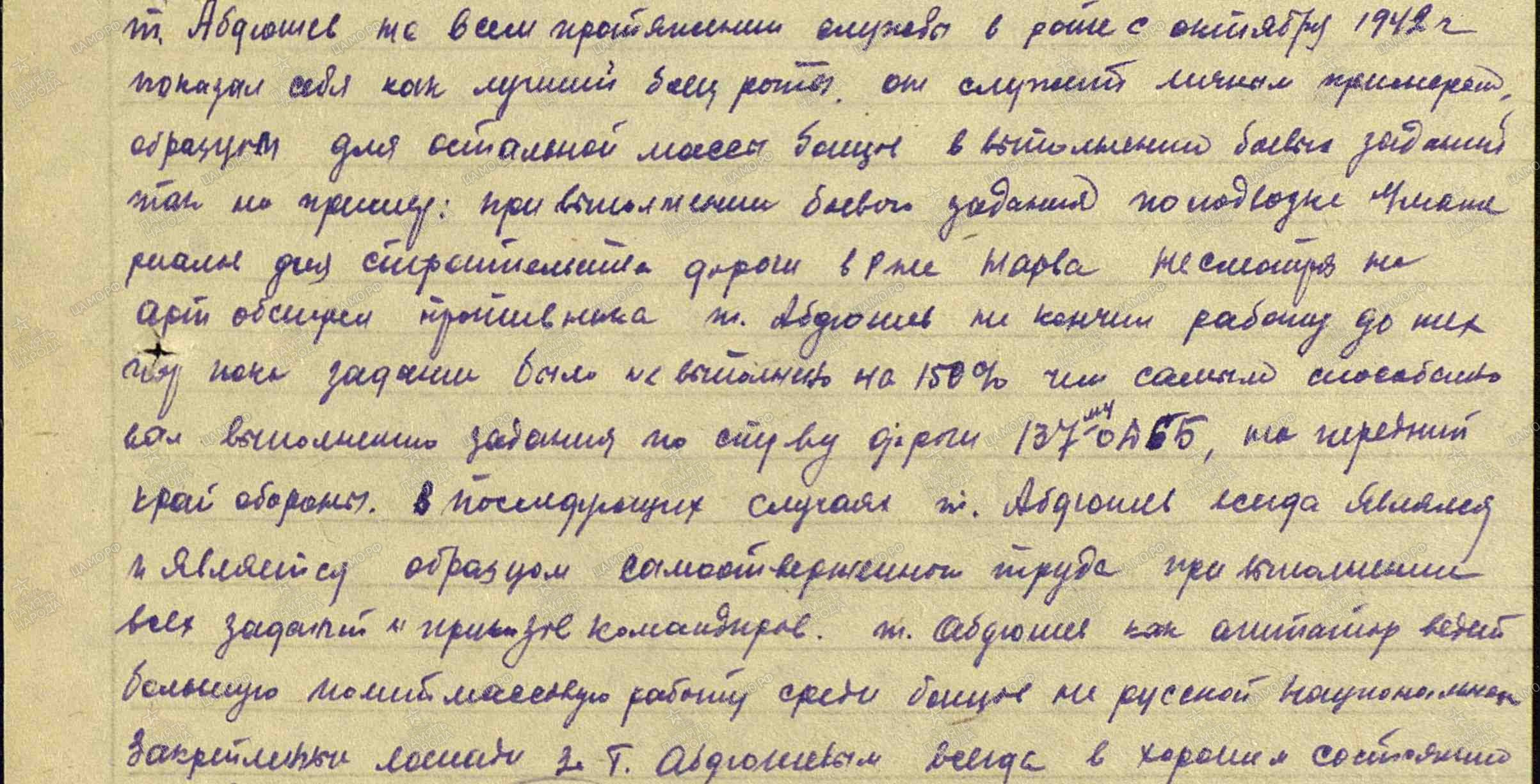 Из наградного листа представленного на орден Красной Звезды: Т.Абдюшев на всем протяжении слуюбы в роте с октября 1942 показал себя как лучший боец роты, он служил личным примером, образцом для остальной массы бойцов в выполнении боевых заданий так на примере: при выполнении боевого задания по подвозке материалов для строительства дороги в р-не Нарва несмотря на арт.обстрел противника ни кончил работу до тех пор пока задание не было выполнено на 150%, тем самым способствовал выполнению задания строительству дороги 137-му ОДББ, на передний край обороны. В последних случаях всегда являлся образцом самоотверженности труда при исполнения всех заданий и приказов командира…»