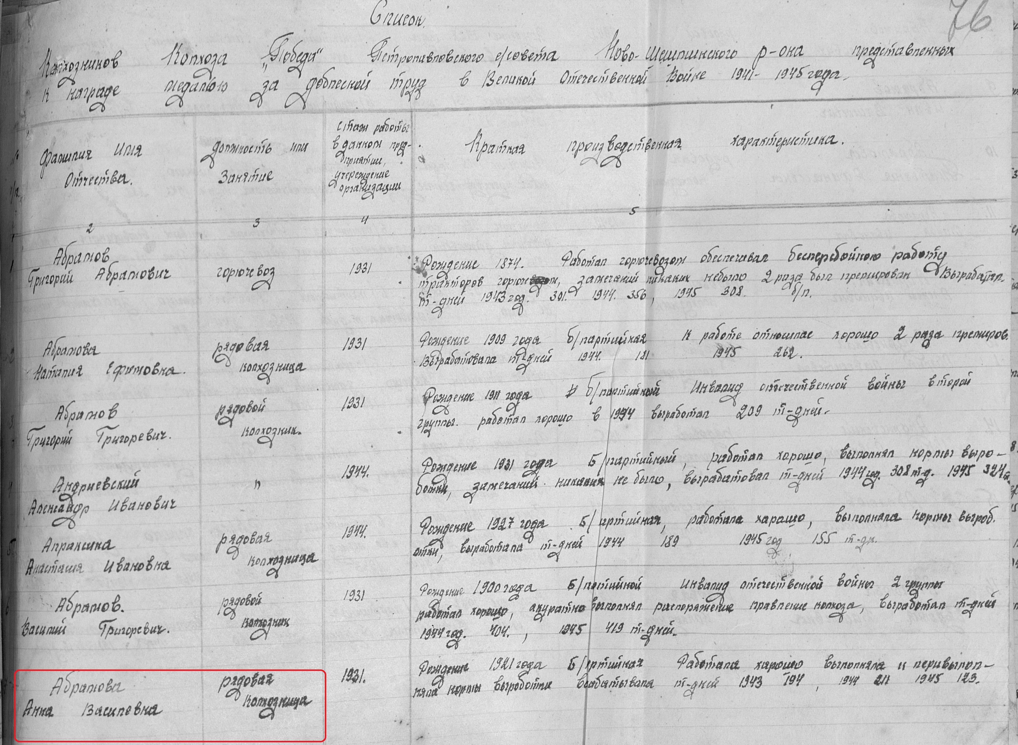 Абрамова Анна Васильевна родилась в 1921 году. Место жительства: с.Сл.Петропавловская Ново-Шешминский район ТАССР. В годы Великой Отечественной войны работала в колхозе «Победа» рядовой колхозницей. Награждена медалью "За доблестный труд в Великой Отечественной войне 1941–1945 гг." (Акт от 01. 1946г.фонд 3610, опись 2, дело №174, лист 76, АК № 325320).