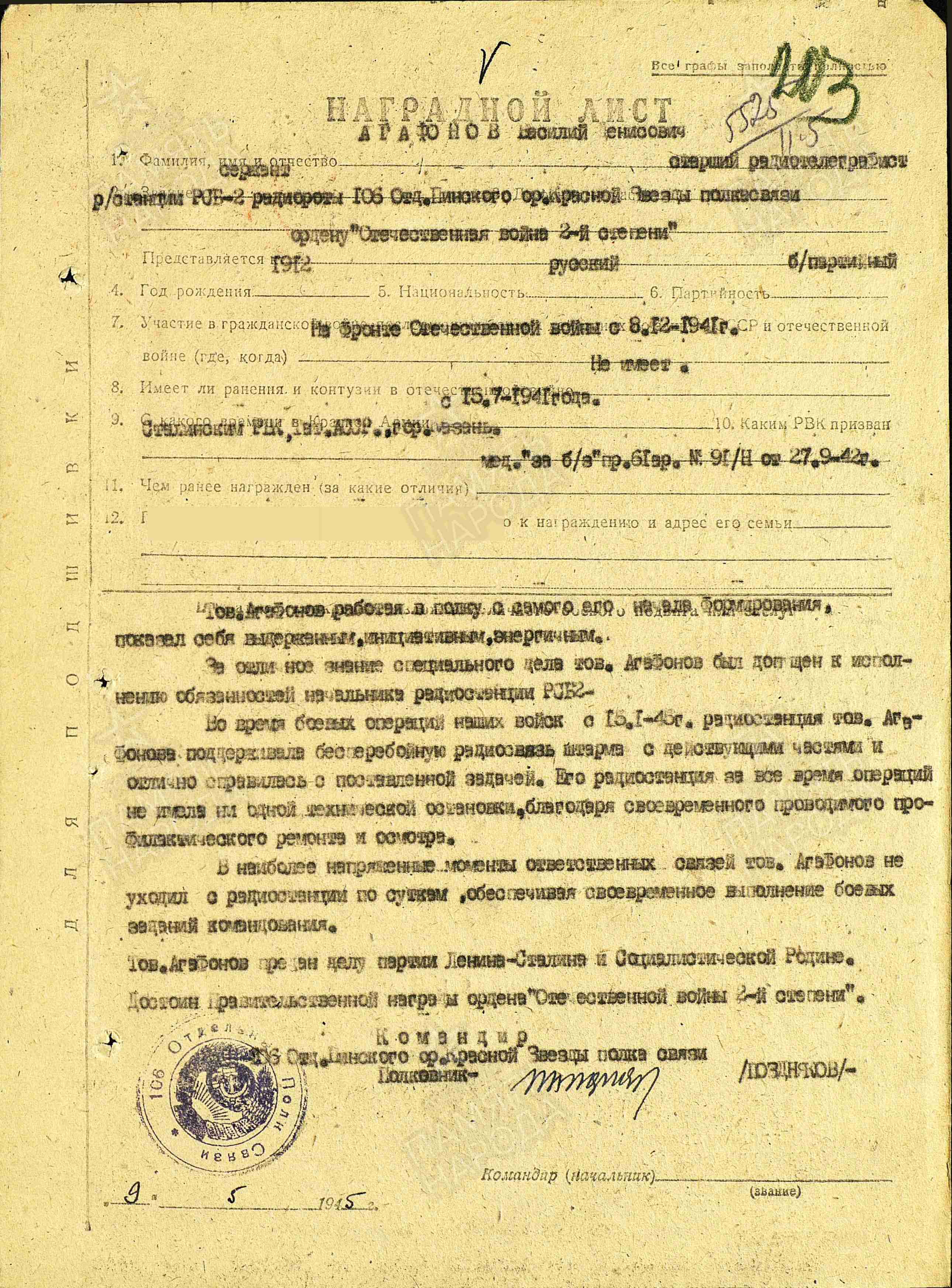 АГАФОНОВ Василий Денисович, 1912, с. Масловка. Мобилизован 15 июля 1941 Сталинским РВК г. Казань. С дек. 1941 воевал на Брянском, Западном, Центральном, Белорусском, 3 Прибалтийском, 2 и 1 Белорусском фронте в составе 61 А. Сержант, нач. радиостанции РСБ 289 отд. батальона связи/ 106 отд. батальона связи. Участник битвы на Курской дуге (северный фас, наступательный этап), освобождения Белоруссии, Украины, Прибалтики, Польши, боёв в Германии. Награждён медалью «За боевые заслуги», орденом Отечественной войны 2 ст. (1945).