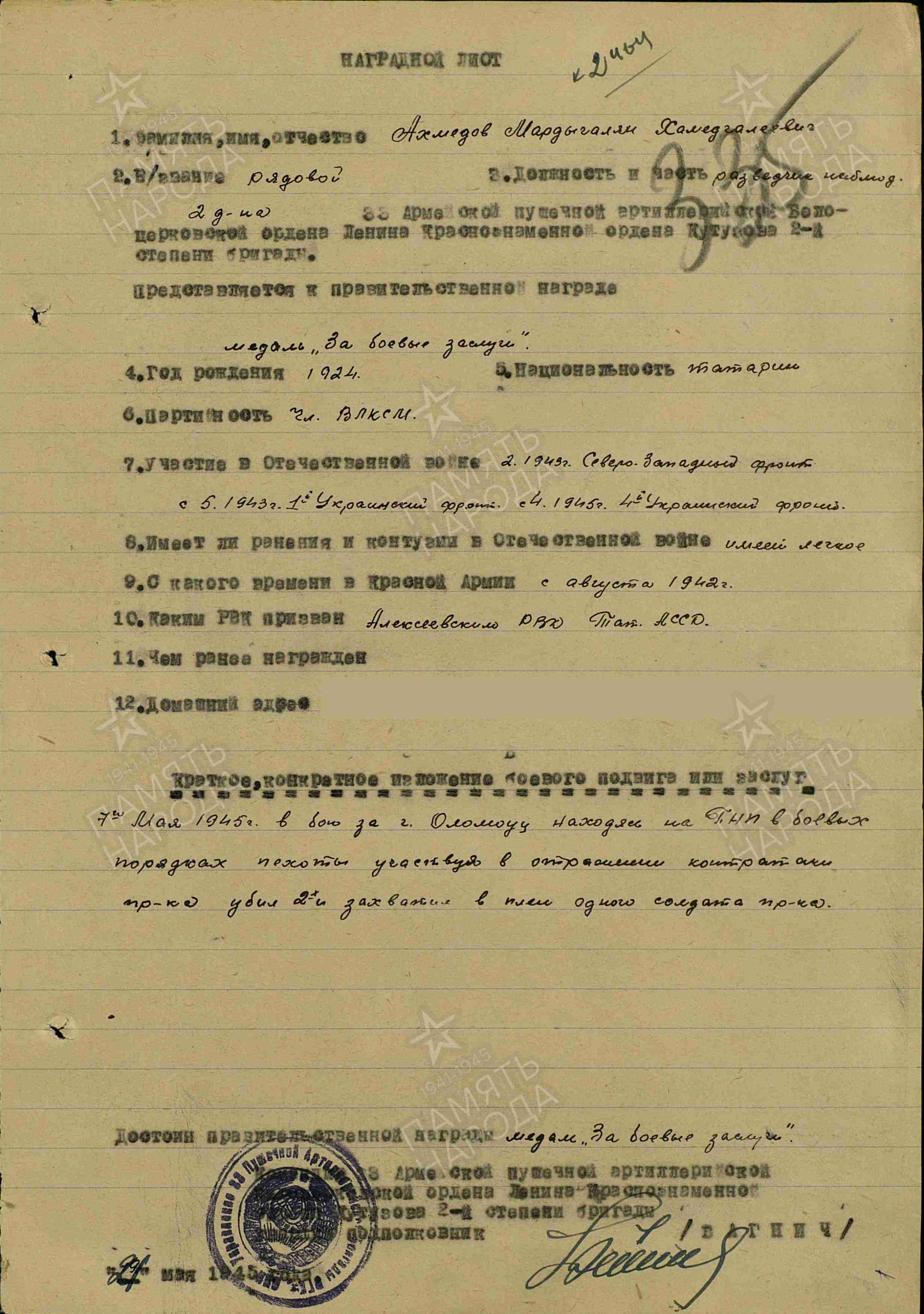 АХМЕТОВ Мардыгалям Хаматгалеевич, 1924, с. Степная Шентала. Мобилизован Алексеевским РВК в авг. 1942. Член ВЛКСМ. Красноармеец (ефрейтор), разведчик-наблюдатель взвода управления дивизиона 33 отд. тяжёлой ПАБр Северо-Зап., Воронежского, 1 и 4 Укр. Фронта. Был легко ранен. Награждён медалями «За отвагу», «За боевые заслуги», орденом Отечественной войны 2 ст. (1985).