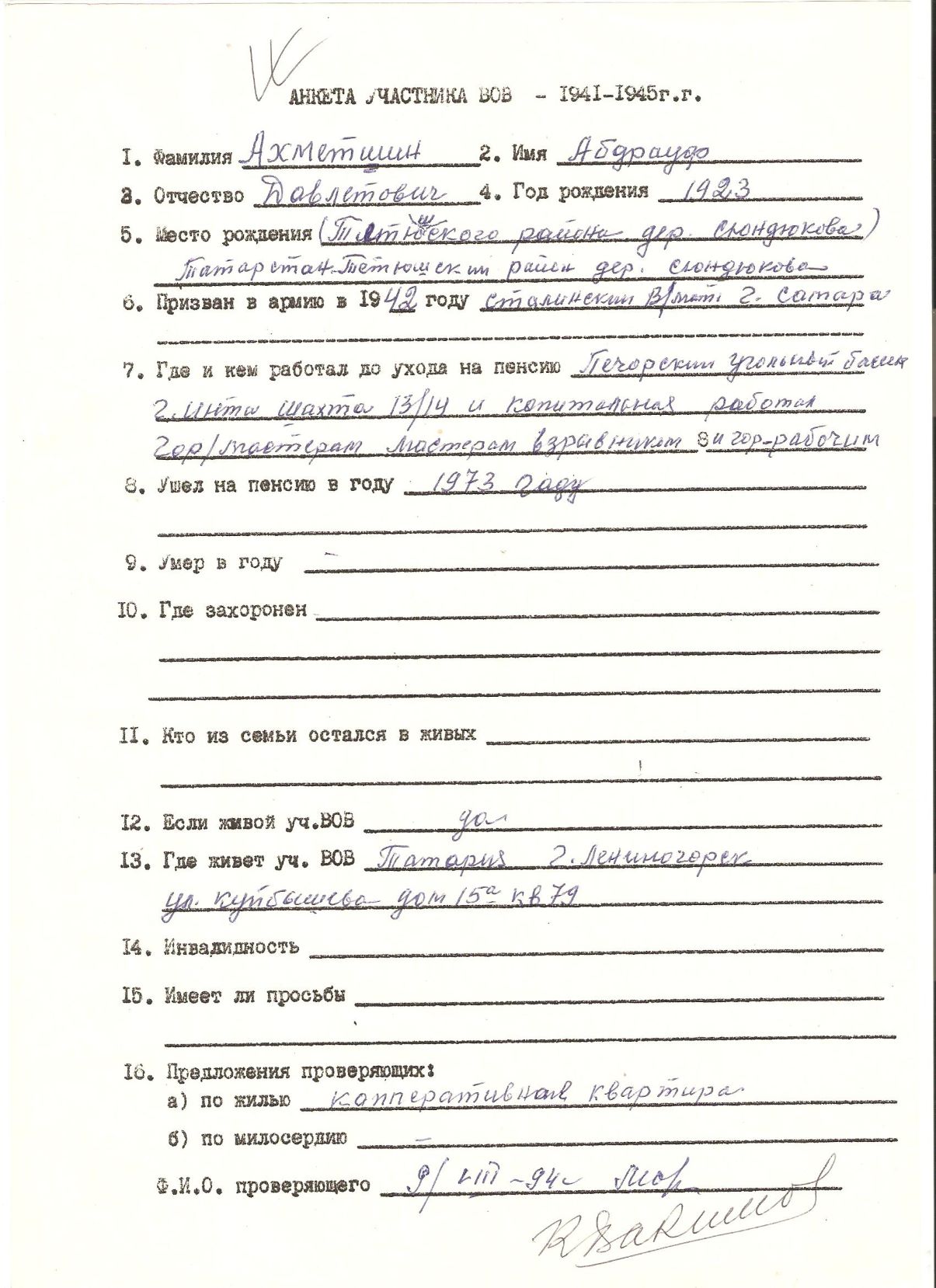 Родился в 1923 году в с. Сюндуюково. Мобилизован в 1942 году Сталинским РВК г. Самара. Рядовой, стрелок. Демобилизован в 1945 году. Работал горным мастером на Печорском угольном бассейне, г. Инта, респ. Коми. Вышел на пенсию в 1973 году. Жил в Лениногорске. Умер в 1999 году.