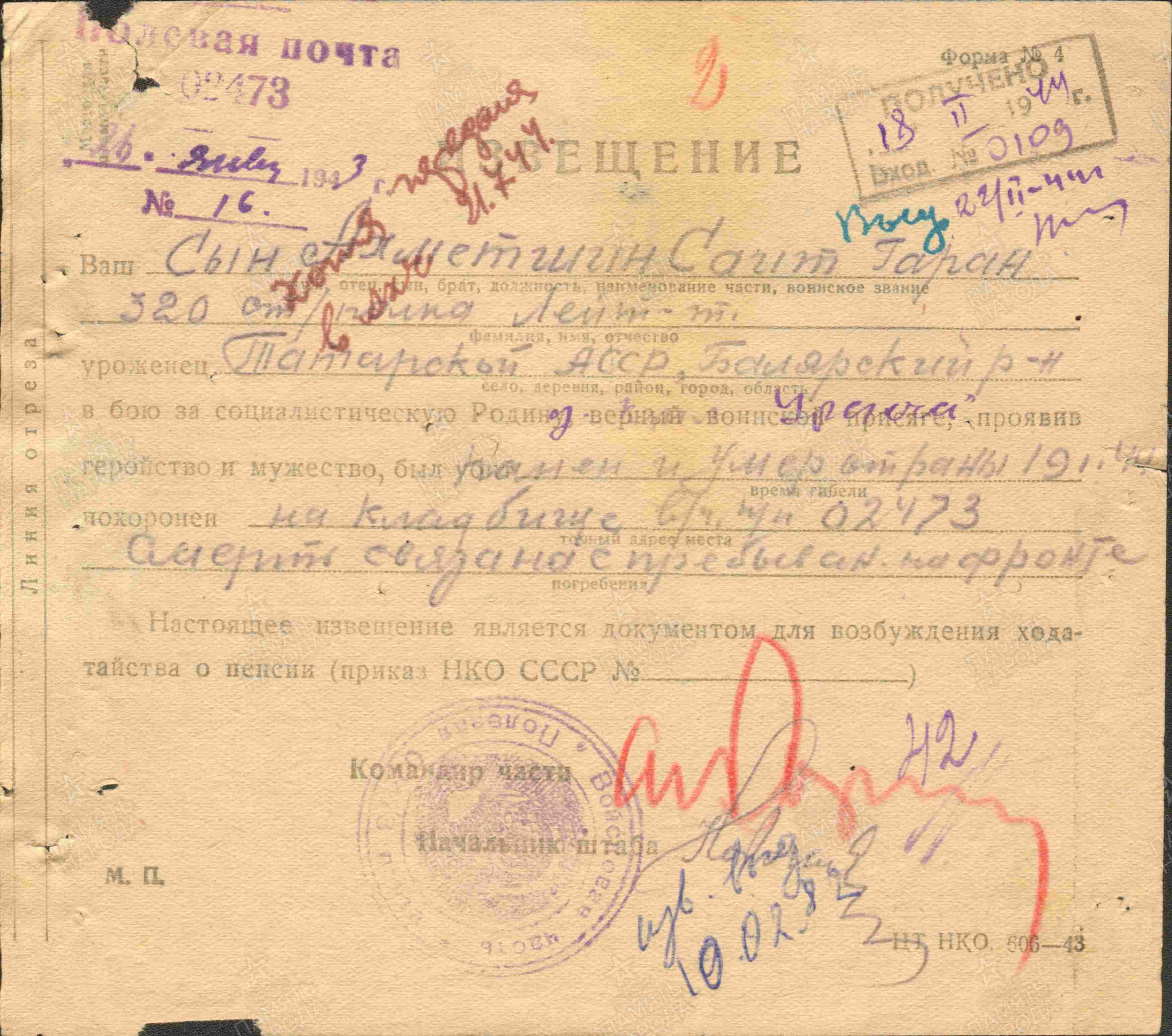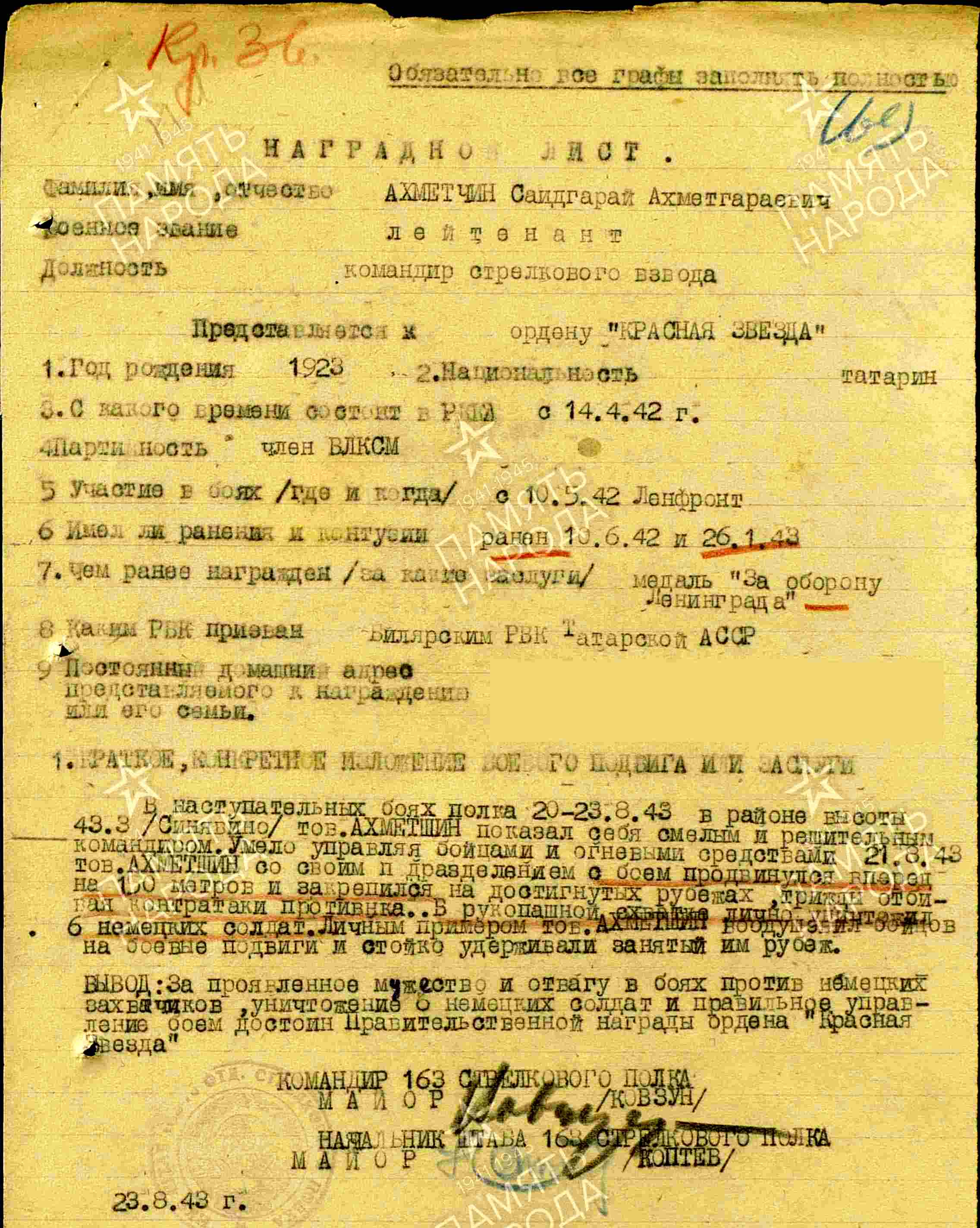 АХМЕТШИН Саидгарай Ахметгараевич, 1923, д. Кызыл Уракча. Мобилизован Билярским РВК 14 апр. 1942. Член ВЛКСМ. Лейтенант, ком. взвода 163 СП и 320 СП 11 СД в составе 67, 54, 8, 2 Уд Армий Ленинградского и Волховского фронта. Дважды ранен. Награждён медалью «За оборону Ленинграда», орденом Красной Звезды. Погиб (умер от ран) 19 янв. 1944, ТППГ 95, Ленинградская обл., Орнаниенбаумский р-н, кв. 39-46, госпитальное кладбище, 2-й господский двор.