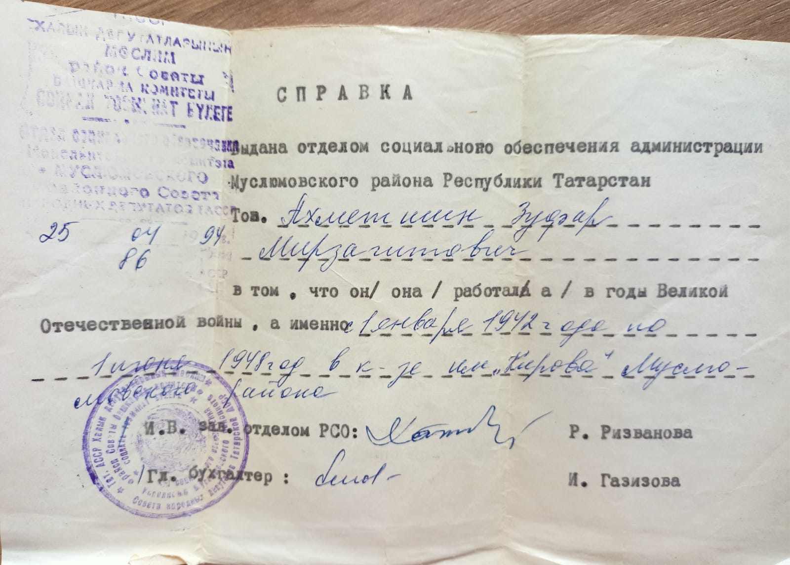 АХМЕТШИН ЗУФАР МИРЗАГИТОВИЧ 1930-1994 ТАТАРСТАН, МУСЛЮМОВСКИЙ РАЙОН, ДЕР.СТАРЫЙ ВАРЯШ