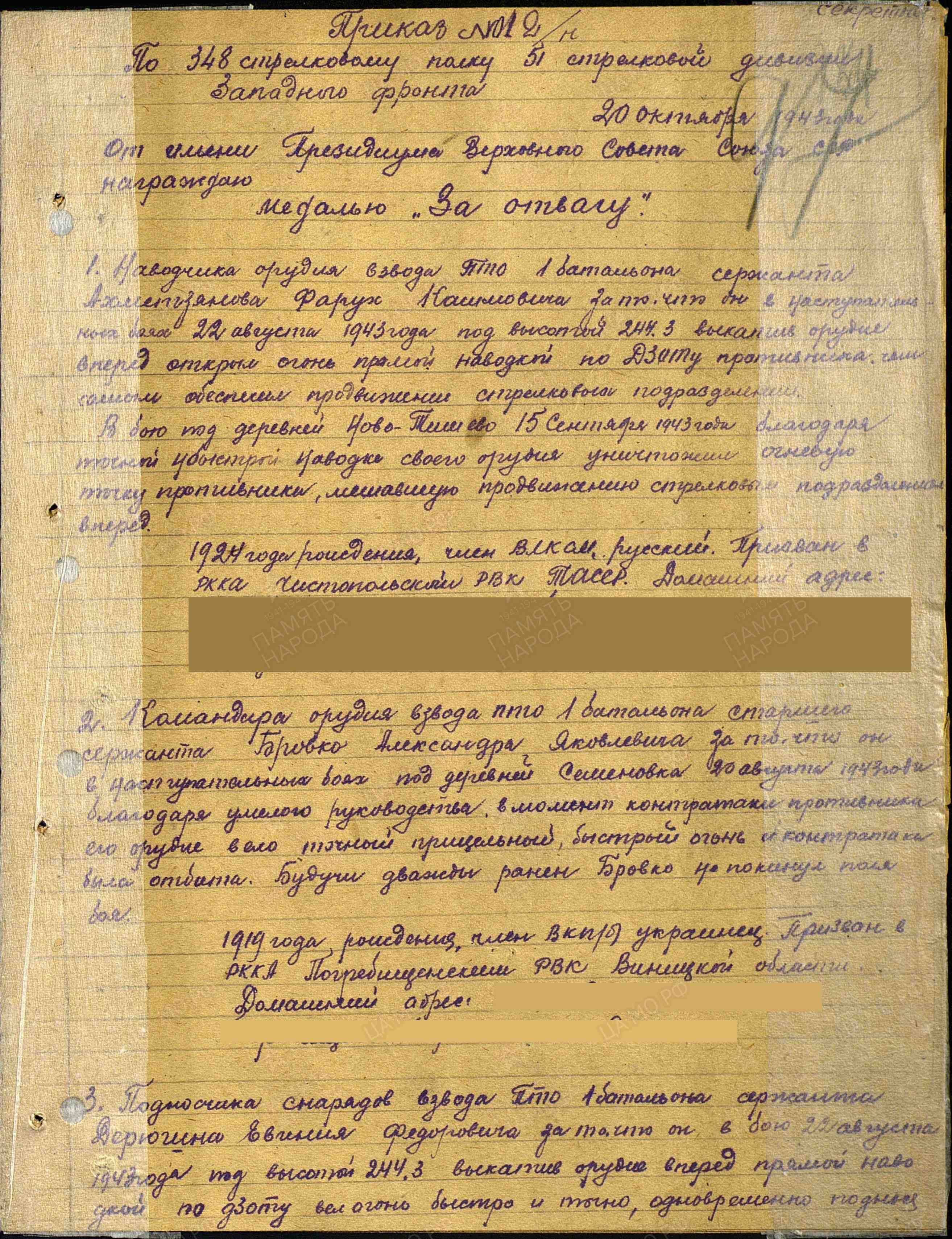 Фарук Касимович Ахметзянов родился в 1924 г. в с.Кутлушкино, Чистопольского района, ТАССР. В 1942 году призван в ряды Красной Армии Чистопольским районным военным комиссариатом. Служил в звании сержанта в должности наводчика орудия взвода ПТО 1 батальона.