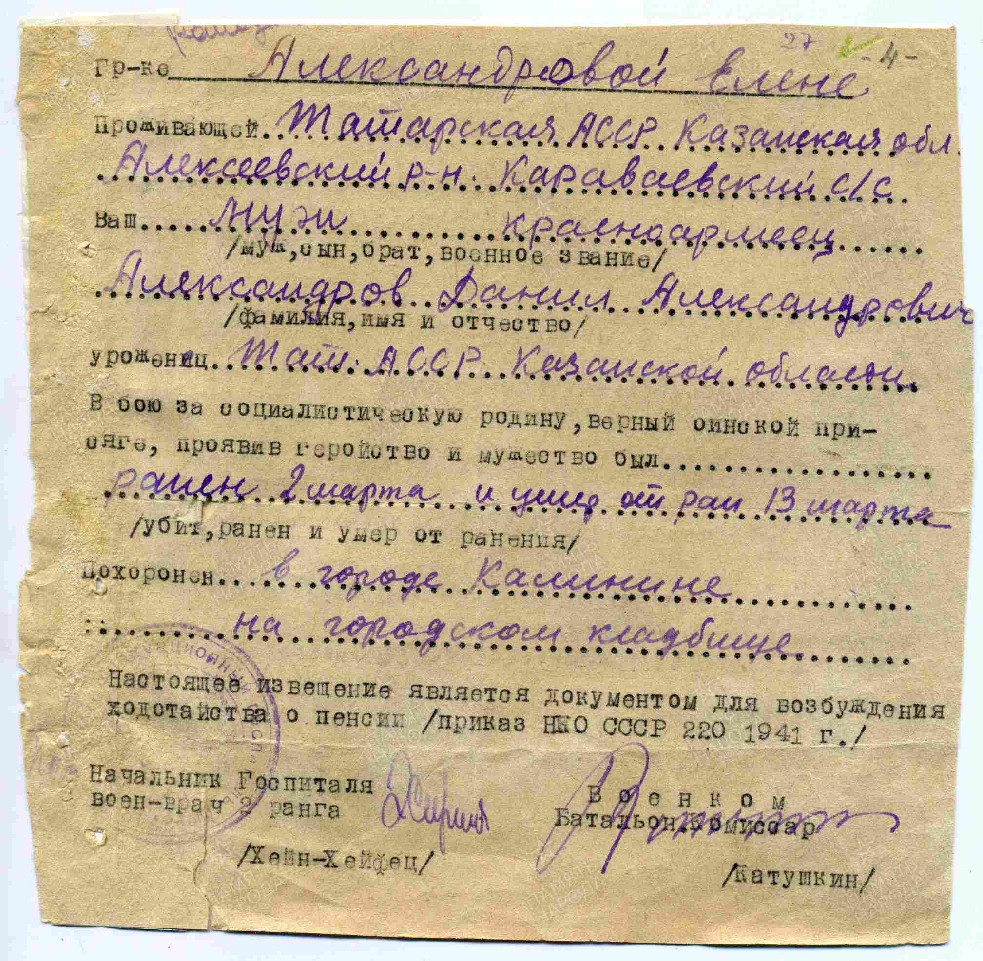 АЛЕКСАНДРОВ Данил Александрович, 1906, пос. Калининский Караваевского с/с. Мобилизован Алексеевским РВК 2 сент. 1941. Красноармеец. Воевал на Калининском фронте. 2 марта 1942 поступил в СЭГ 2749 с тяжёлым воспалительным заболеванием (ранением). Умер 13 марта 1942, похоронен в г. Калинин (Тверь).