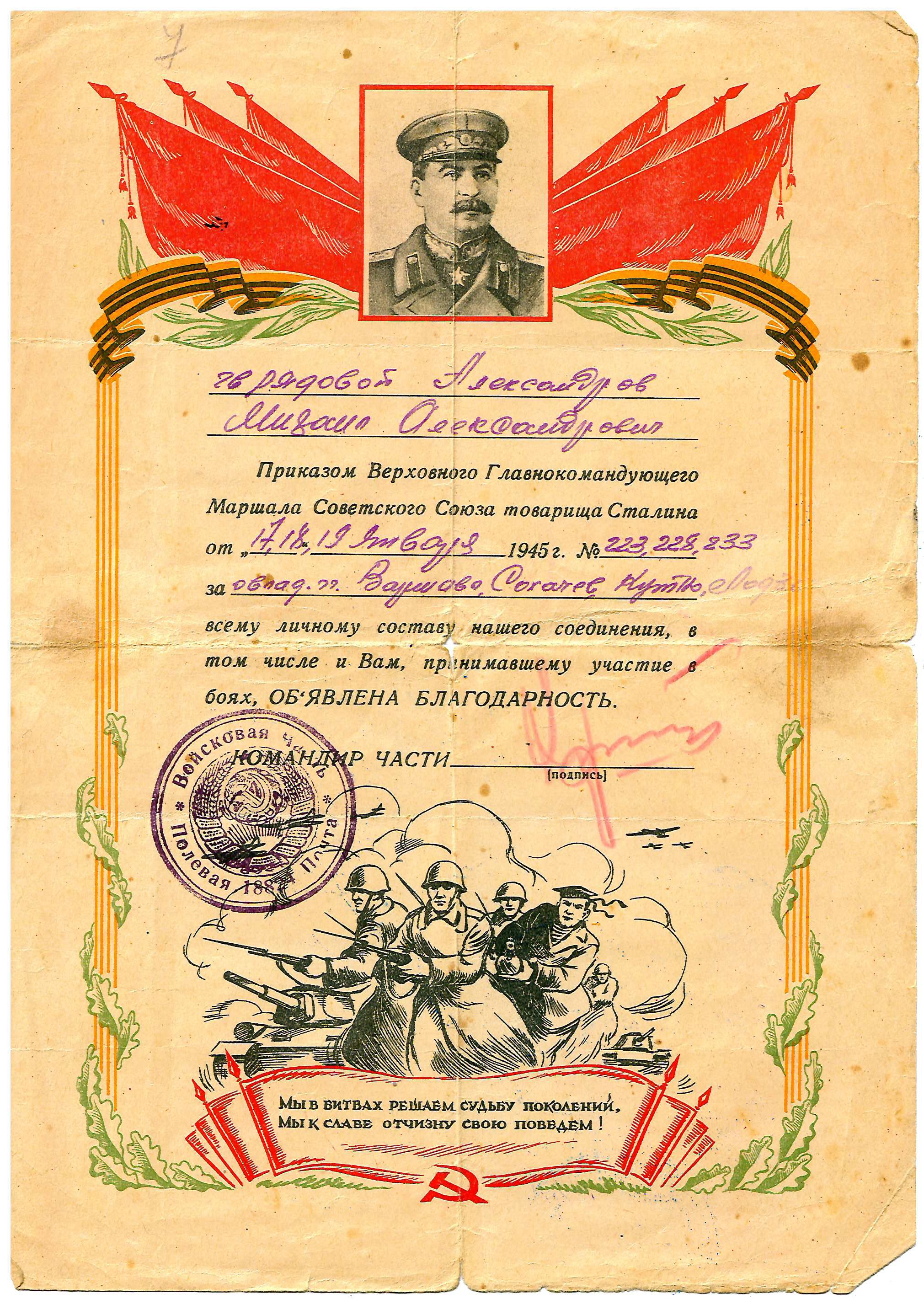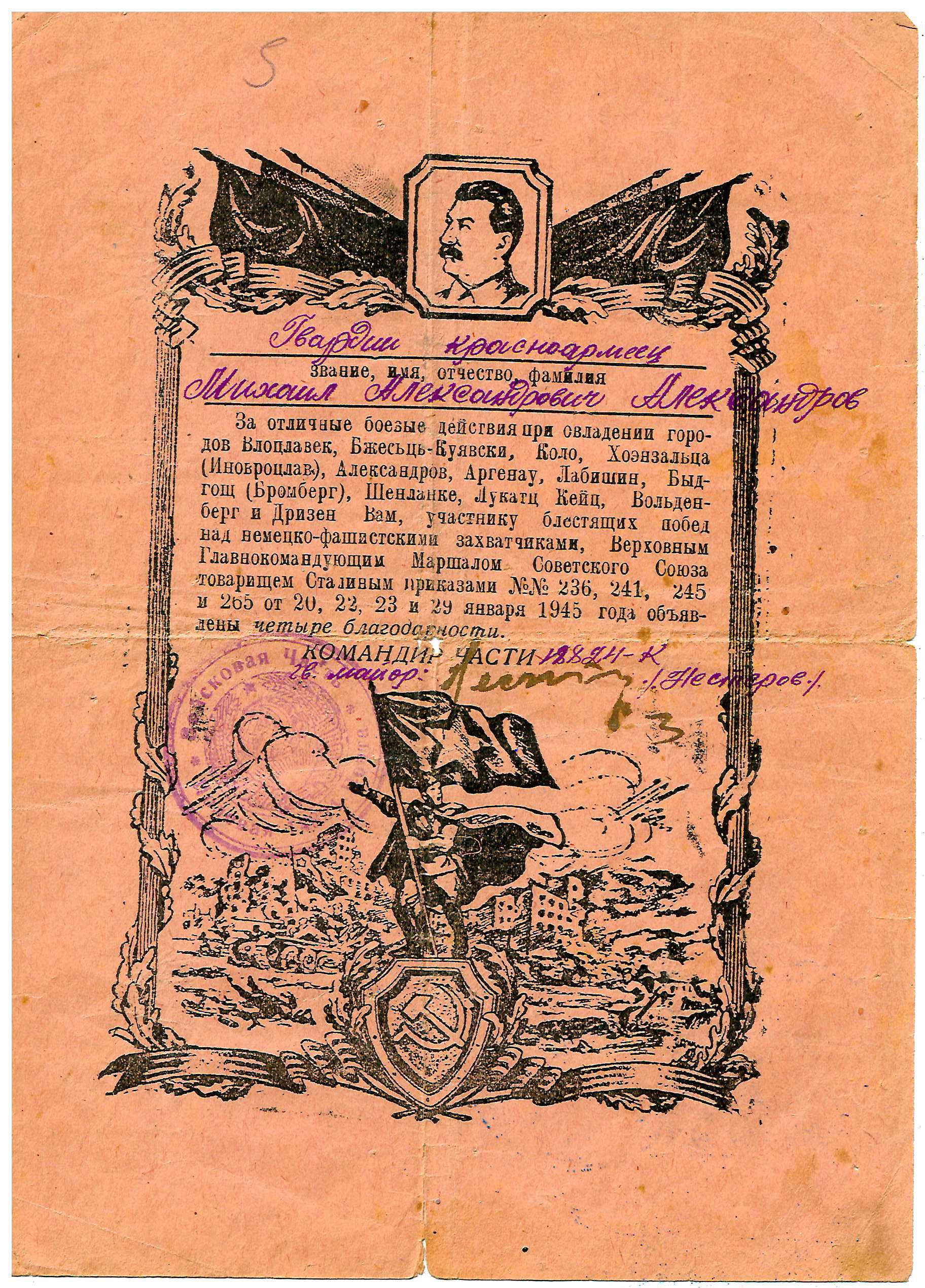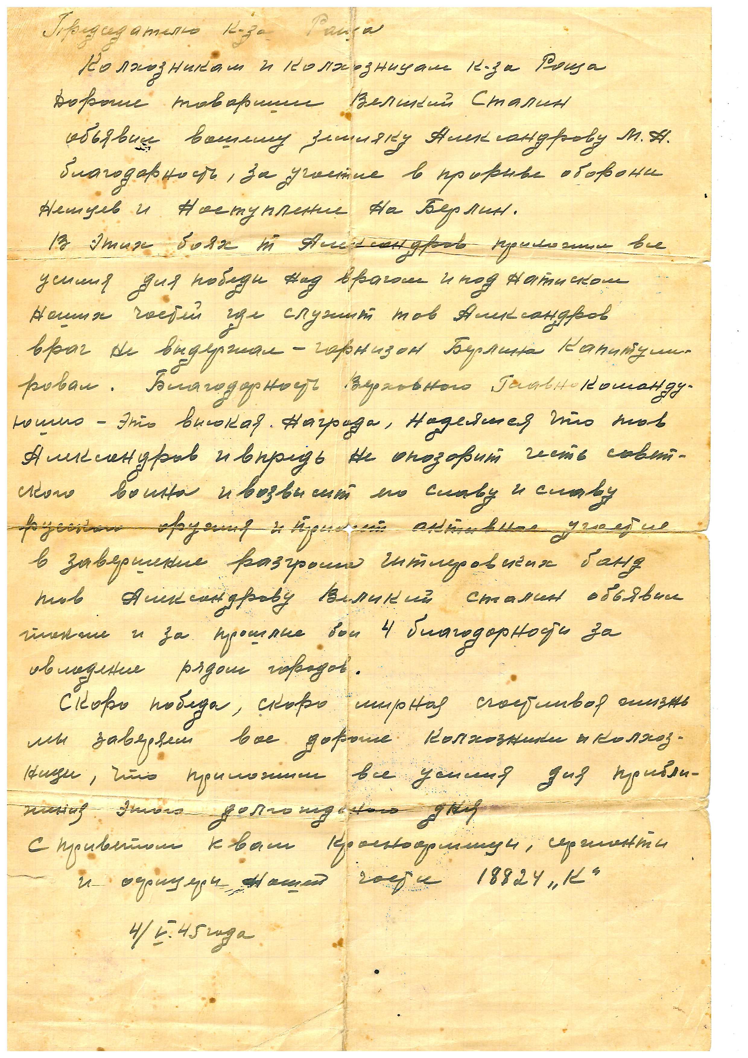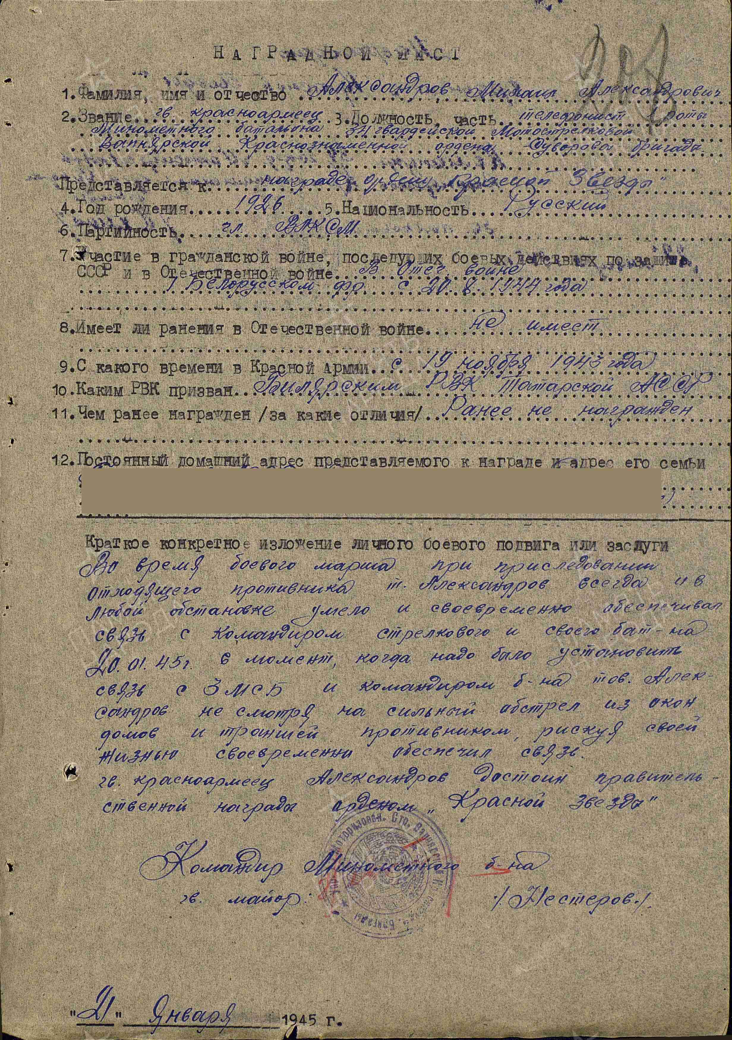АЛЕКСАНДРОВ Михаил Александрович, 1926, д. Русская Майна. До призыва в армию работал в к-зе "Роща". Мобилизован Билярским РВК 19 нояб. 1943. Член ВЛКСМ. На фронте с осени 1944. Гв. красноармеец, телефонист миномётного батальона 34 гв. МСБр 12 гв. ТК 8 гв. А и 2 гв. ТА 1 БелФ. Участник освобождения Польши, штурма Берлина. Награждён орденами Красной Звезды, Отечественной войны 2 ст. (1945), медалями "За освобождение Варшавы", «За взятие Берлина».