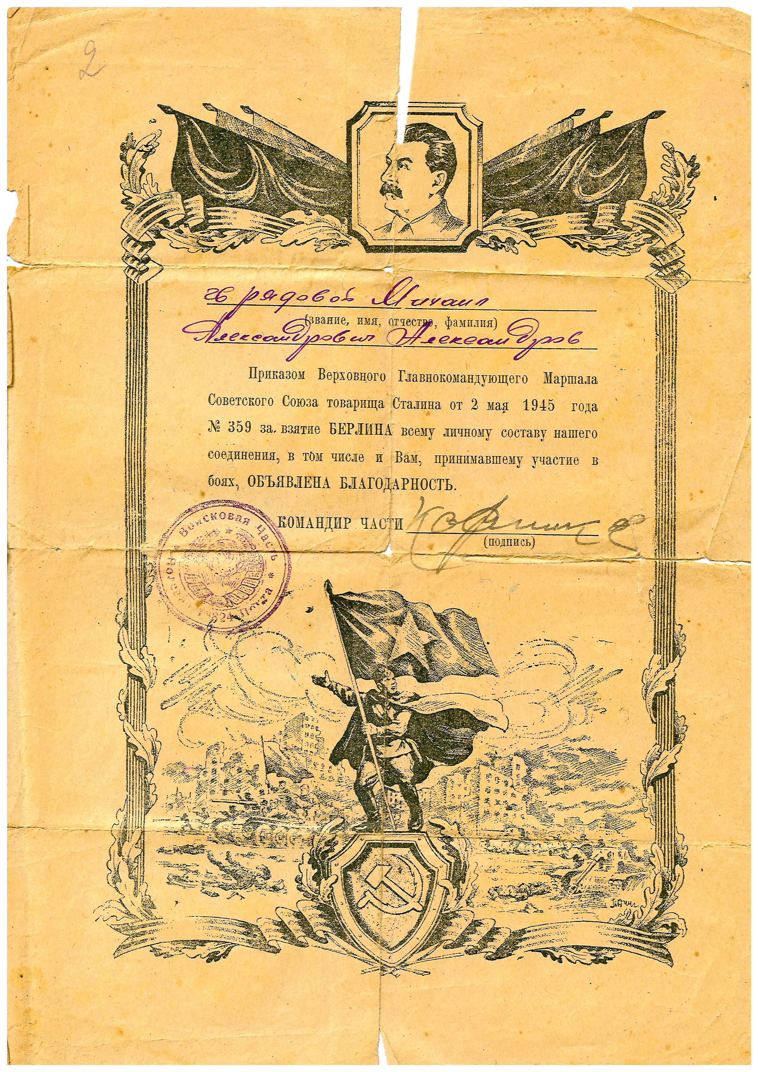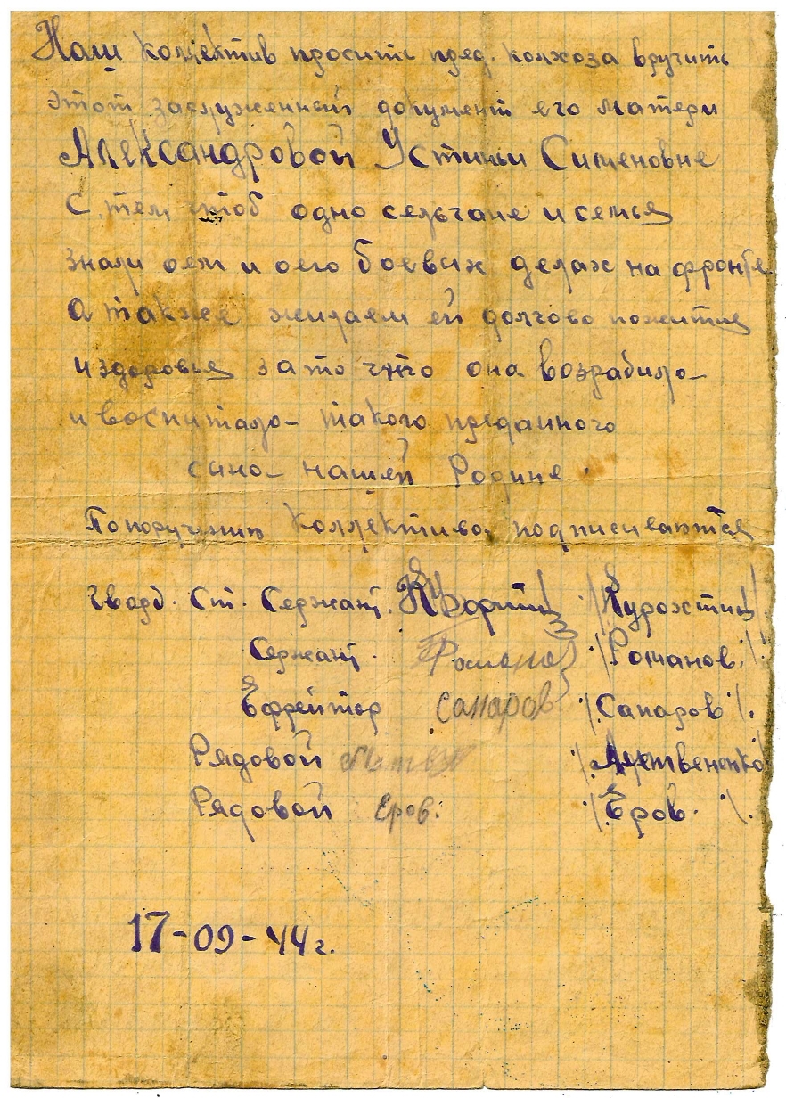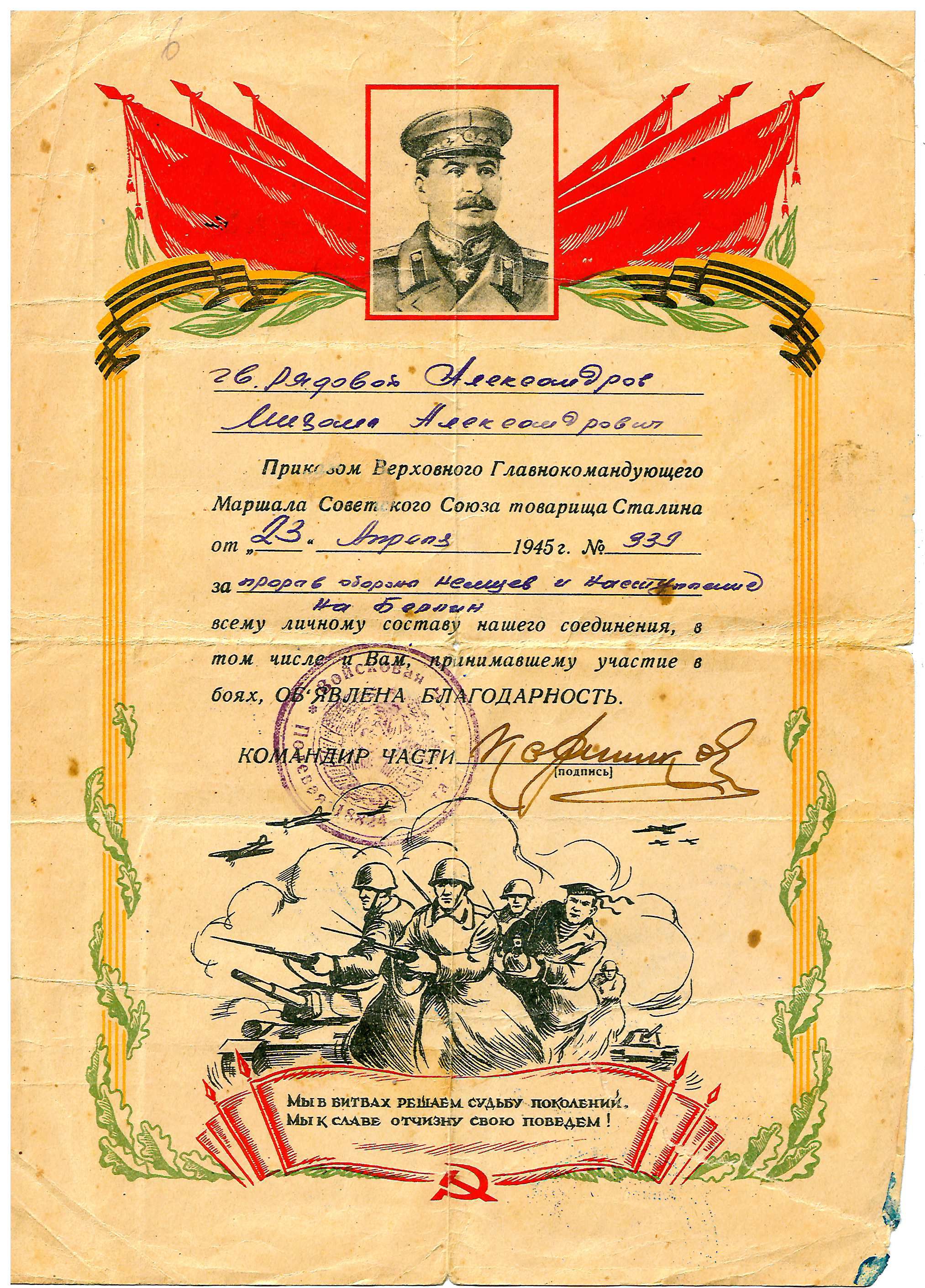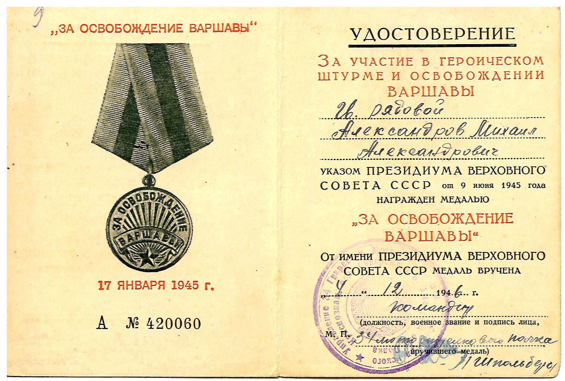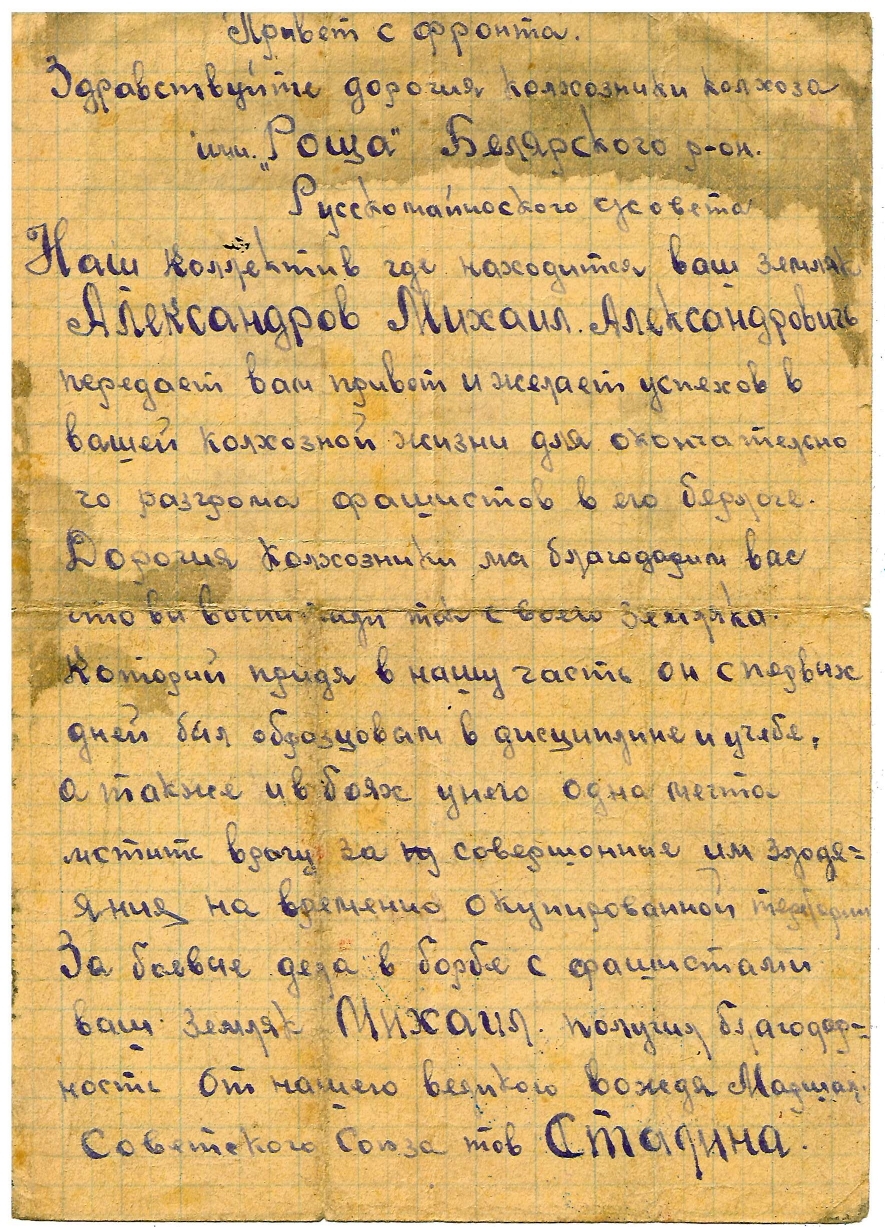 АЛЕКСАНДРОВ Михаил Александрович, 1926, д. Русская Майна. До призыва в армию работал в к-зе "Роща". Мобилизован Билярским РВК 19 нояб. 1943. Член ВЛКСМ. На фронте с осени 1944. Гв. красноармеец, телефонист миномётного батальона 34 гв. МСБр 12 гв. ТК 8 гв. А и 2 гв. ТА 1 БелФ. Участник освобождения Польши, штурма Берлина. Награждён орденами Красной Звезды, Отечественной войны 2 ст. (1945), медалями "За освобождение Варшавы", «За взятие Берлина».