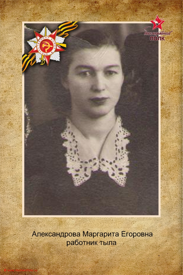АЛЕКСАНДРОВА МАРГАРИТА ЕГОРОВНА Район: КазаньТруженики тыла Опубликовано 5 мая, 2020 - 12:08 пользователем Евгения Левагина