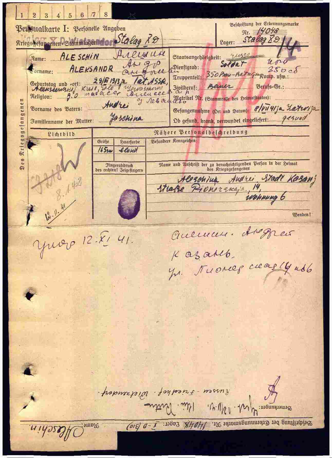 АЛЁШИН Александр Андреевич, 1913, с. Левашево. Мобилизован Бауманским РВК г. Казань 1 марта 1941. Красноармеец, 350 отд. строительный батальон, Прибалтика. 8 июля 1941, на территории ЛатССР, попал в плен. Содержался в лагере XD (310) Витцендорф, Нижняя Саксония, Германия. Умер 12 нояб. 1941.