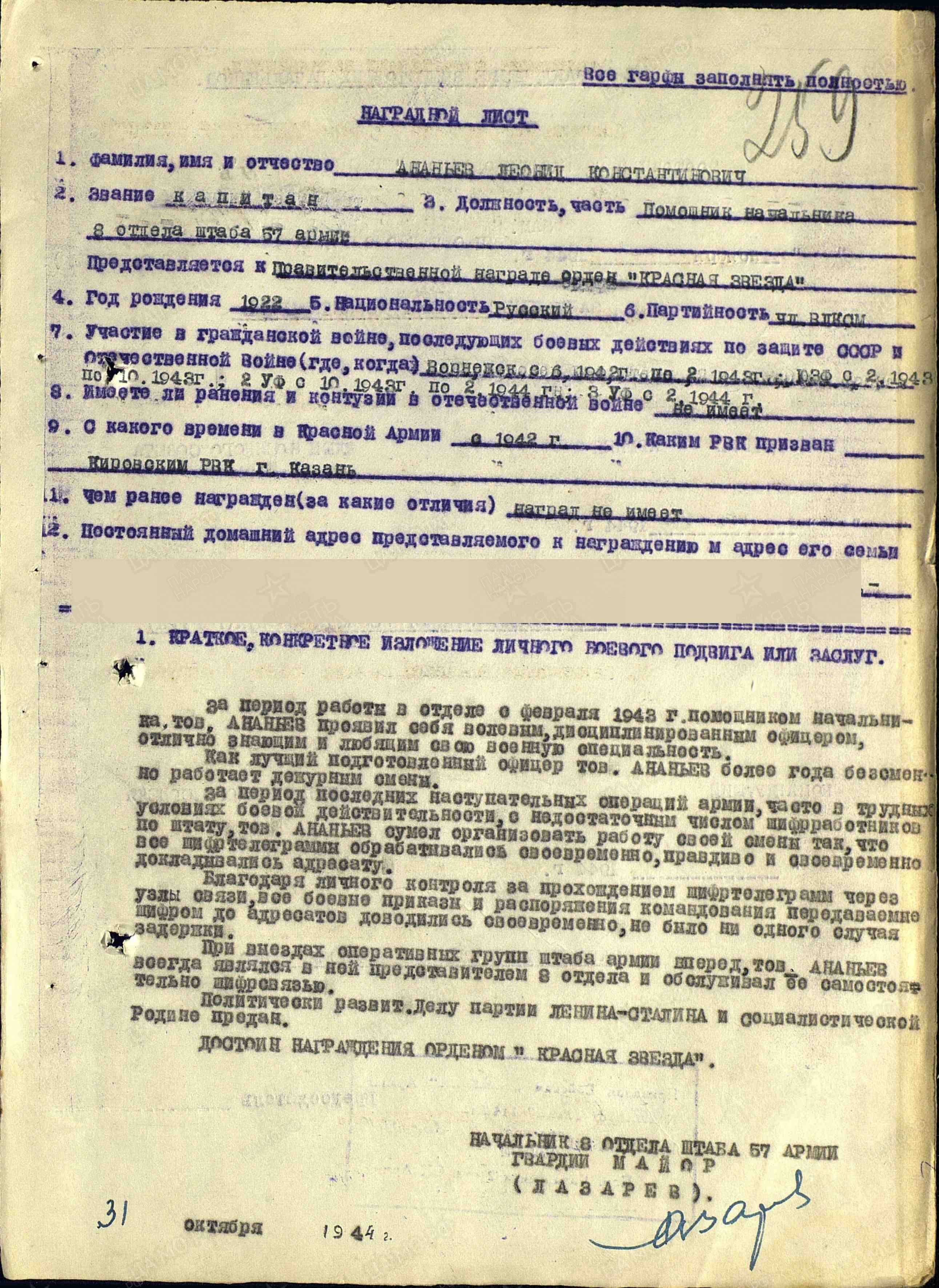 Леонид Константинович родился в 1922 году в г.Чистополе. В ряды Красной Армии был призван Кировским РВК г.Казани в 1942 году. Капитан Ананьев Леонид служил в должности помощника начальника 8 отдела штаба 57 армии. 31 октября 1944 года был награжден орденом Красной Звезды.