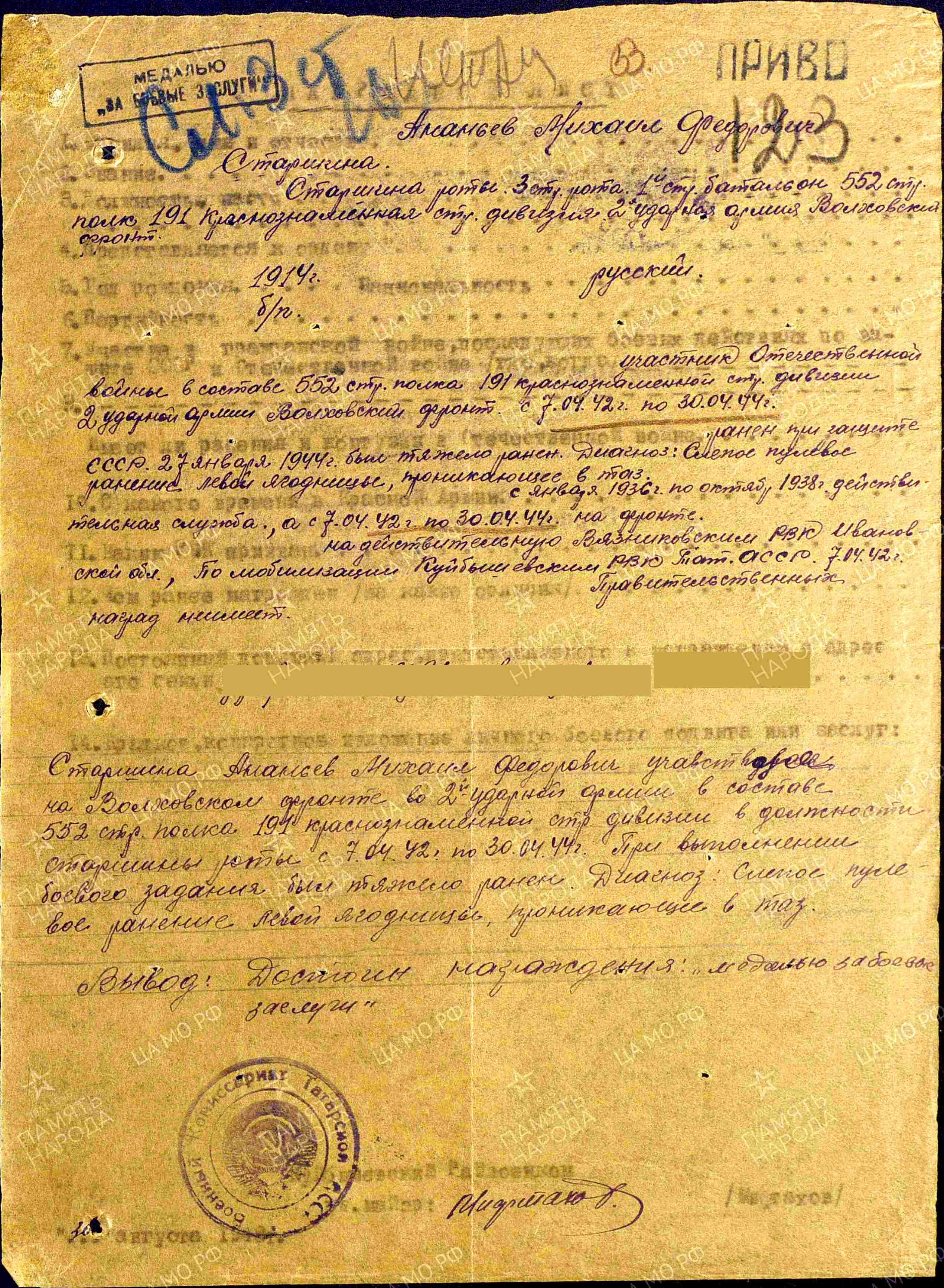 АНАНЬЕВ Михаил Фёдорович, 1914, д. Ямкино. В 1936-1938гг. проходил срочную службу в РККА. Мобилизован Куйбышевским РВК ТАССР 7 апреля 1942г. Старшина. Воевал в составе 552 СП 191 СД 2 УдА Волховского фронта. 27 января 1944г. в наступательном бою получил слепое проникающее пулевое ранение левой части таза. В 1948г. представлен к медали "За боевые заслуги", награждён орденом Славы 3 ст.
