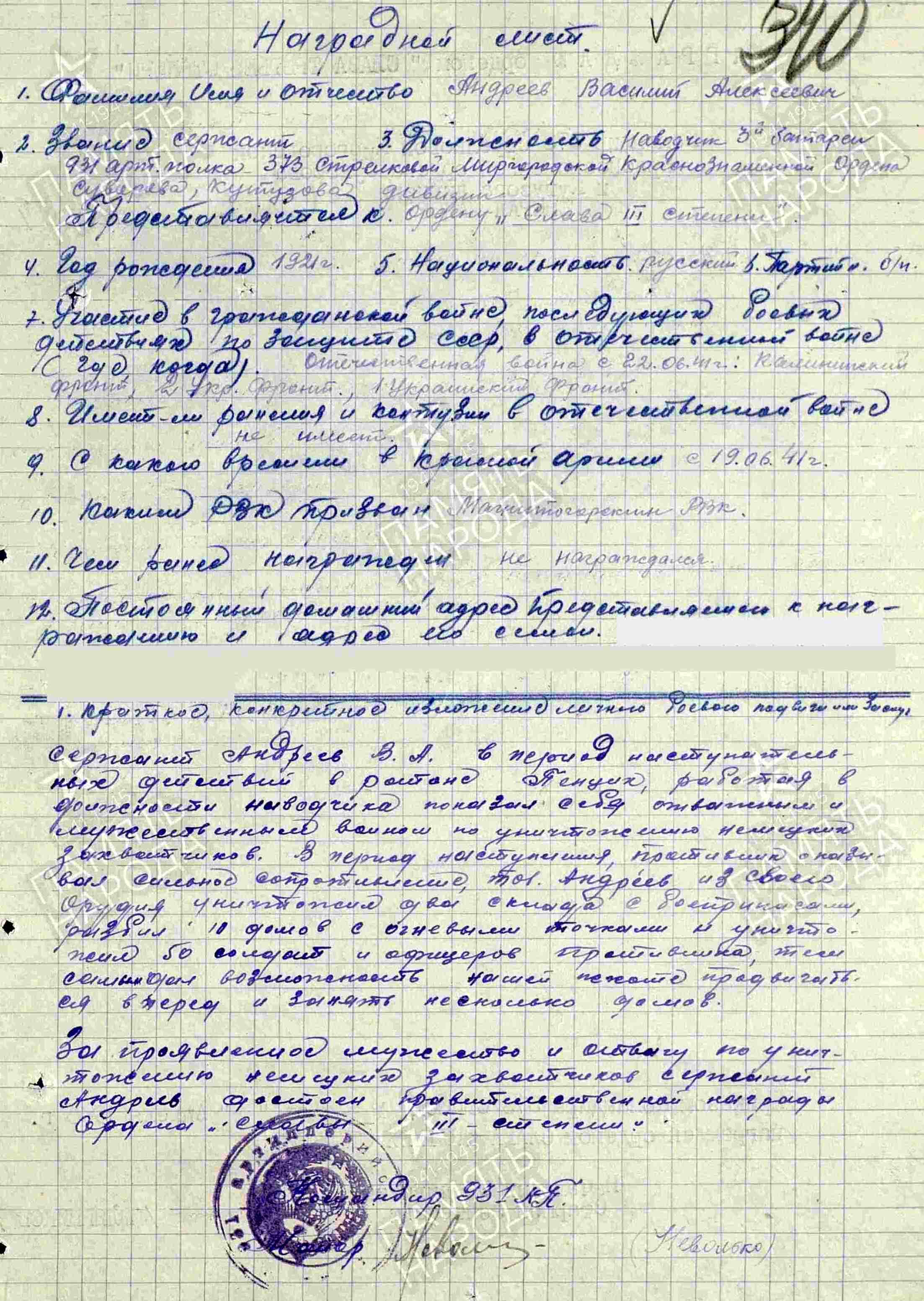 АНДРЕЕВ Василий Алексеевич, 1921, с. Лебяжье. Мобилизован Магнитогорским РВК 19 июня 1941. Воевал на Калининском, Воронежском, 2 и 1 Укр. фронтах. В боях на Ржевском направлении, в составе 1225 СП 369 СД 39 и 29 А, был ошибочно учтён пропавшим без вести. В 1945 – сержант, наводчик 931 АП 373 СД 52 А. 12 янв. 1945, при форсировании р. Одер юго-западнее г. Сандомир, точной наводкой орудия уничтожил миномётную батарею, пулемётную точку, рассеял и уничтожил до 40 солдат и офицеров противника. В апрельских боях уничтожил два склада с боеприпасами, разбил 10 домов с огневыми точками и истребил до 50 солдат/офицеров врага. Награждён медалью «За отвагу», орденом Славы 3 ст.
