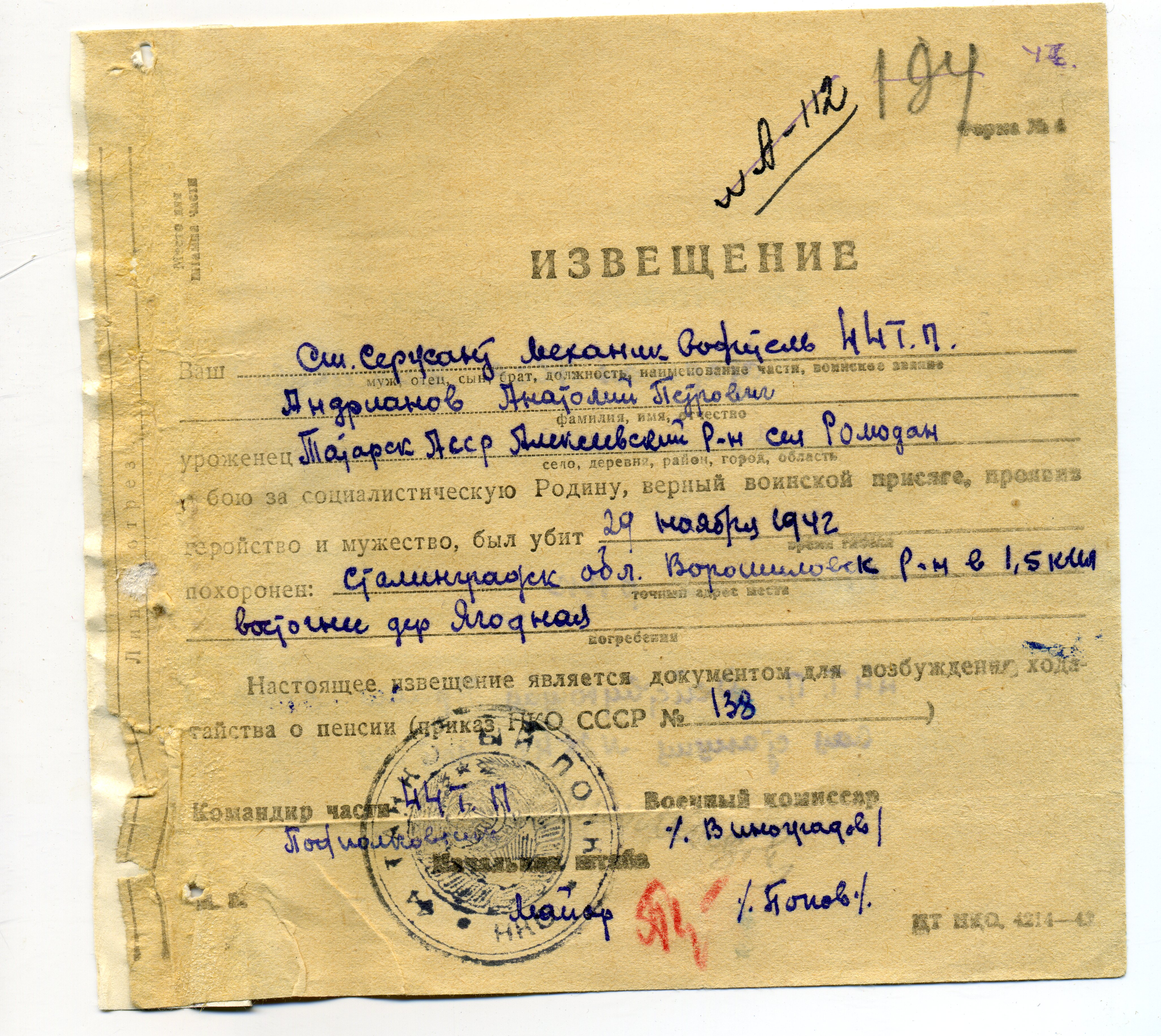 АНДРИАНОВ Анатолий Петрович (1923 г.р., с. Ромодан). Ст. с-т, механик-водитель 14 ТП, 17 механизированная бригада. Погиб 29.11.1942г. у д. Попово Руднянского района Волгоградской обл.