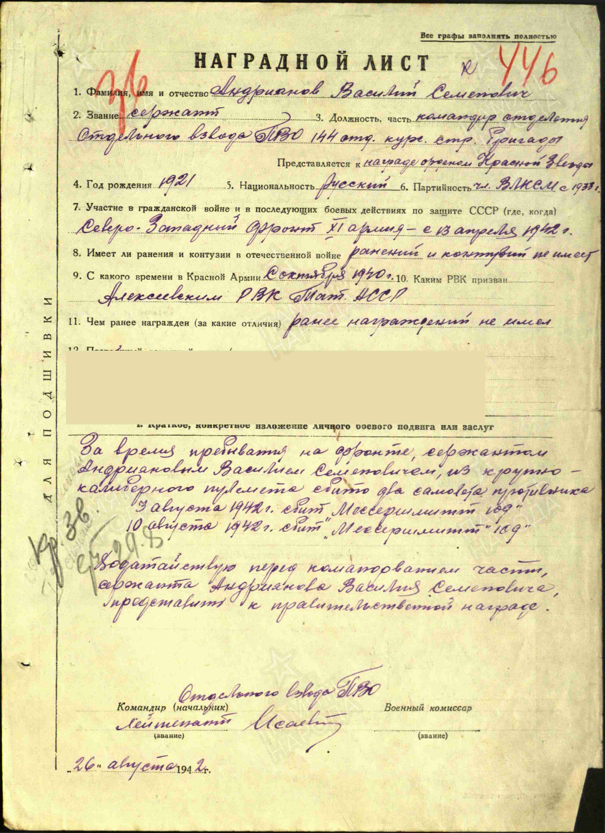 АНДРИЯНОВ Василий Семёнович, 1921, д. Зотеевка. Член ВЛКСМ. Мобилизован Алексеевским РВК в окт. 1940. Сержант, ком. отделения взвода ПВО 144 отд. СБр 11 А Сев.-Зап.Ф. Сбил из крупнокалиберного пулемёта два самолёта Ме-109 3 и 10 авг. 1942. Награждён орденом Красной Звезды. С сент. – 582 ЗенАП 22 и 34 А Сев.-Зап.Ф. Демобилизован в 1944 по ранению – инвалид 1 гр. по зрению.