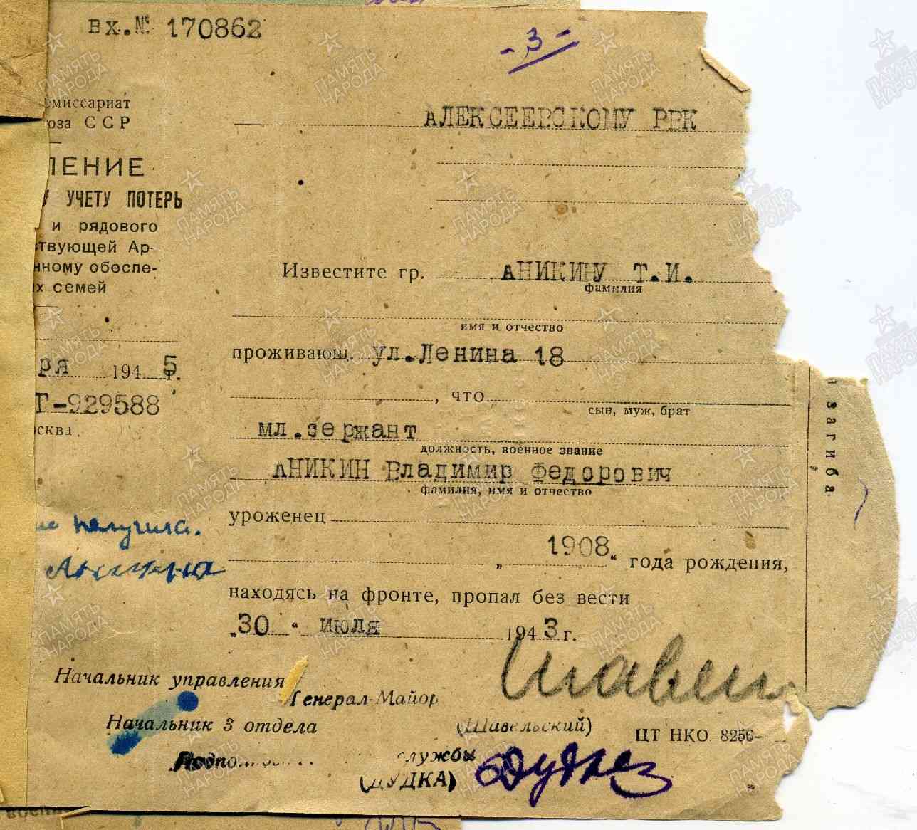 АНИКИН Владимир Фёдорович, 1908, с. Большие Полянки. Работал сплавщиком в г. Зеленодольск. Мобилизован Зеленодольским РВК 2 сент. 1941. Красноармеец. Был ранен (?). Повторно мобилизован Алексеевксим РВК 3 авг. 1942. Мл. сержант. Учтён пропавщим без вести 30 июля 1943. По данным ГА РТ – попал в плен, был освобождён.
