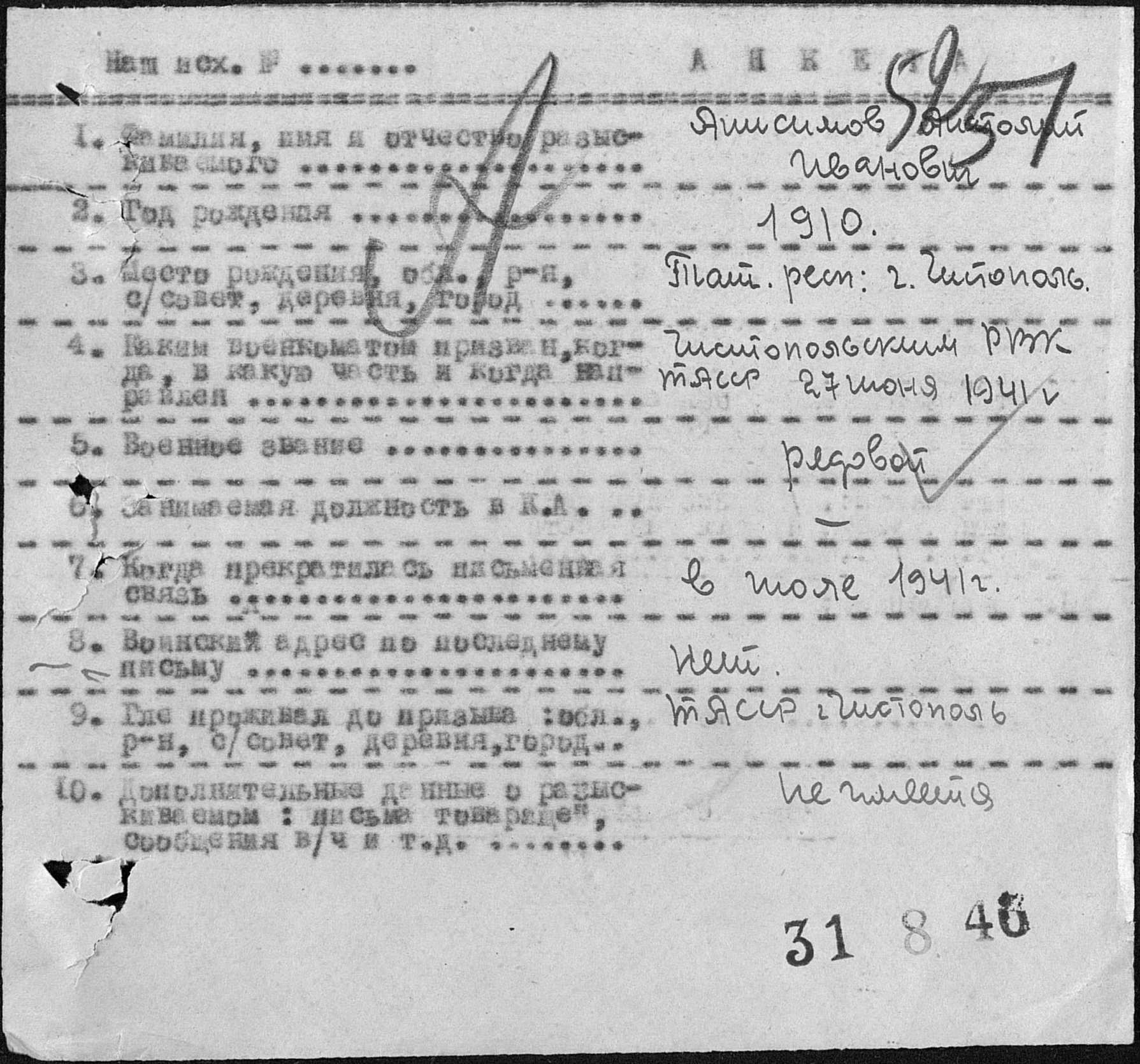 Родился 20.01.1910 г. в Чистополе. Призван 27.06.1941 г. Чистопольским РВК. Воинское звание солдат (рядовой). Лагерный номер 20785. Пленен 05.08.1941 г. Место пленения Муствеэ. Содержался в шталаге XII F. Погиб в плену 26.12.1944 г. Место захоронения Больхен/Форбах.