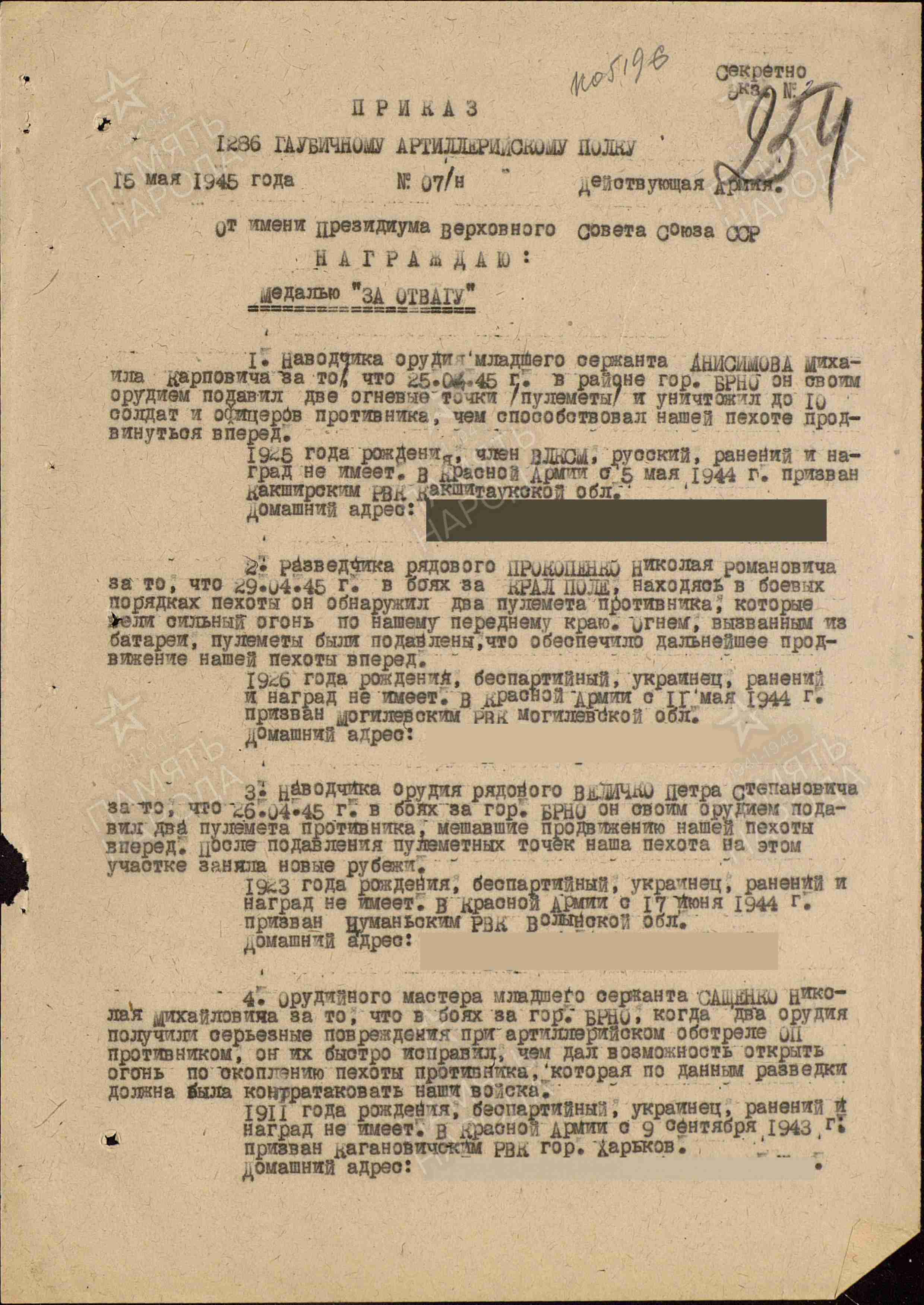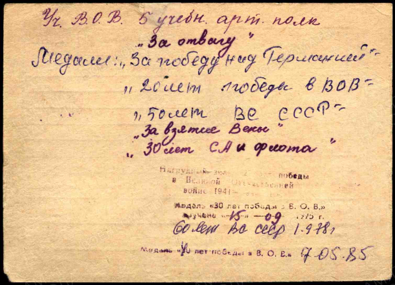 Призван Какширским РВК, Какшитаукская области. Воинское звание мл. сержант –наводчик. Воинская часть 1286 гаубичный артиллерийский полк 2 Украинский фронт. Участвовал в боях за овладение городом Брно на территории Чехословакии.