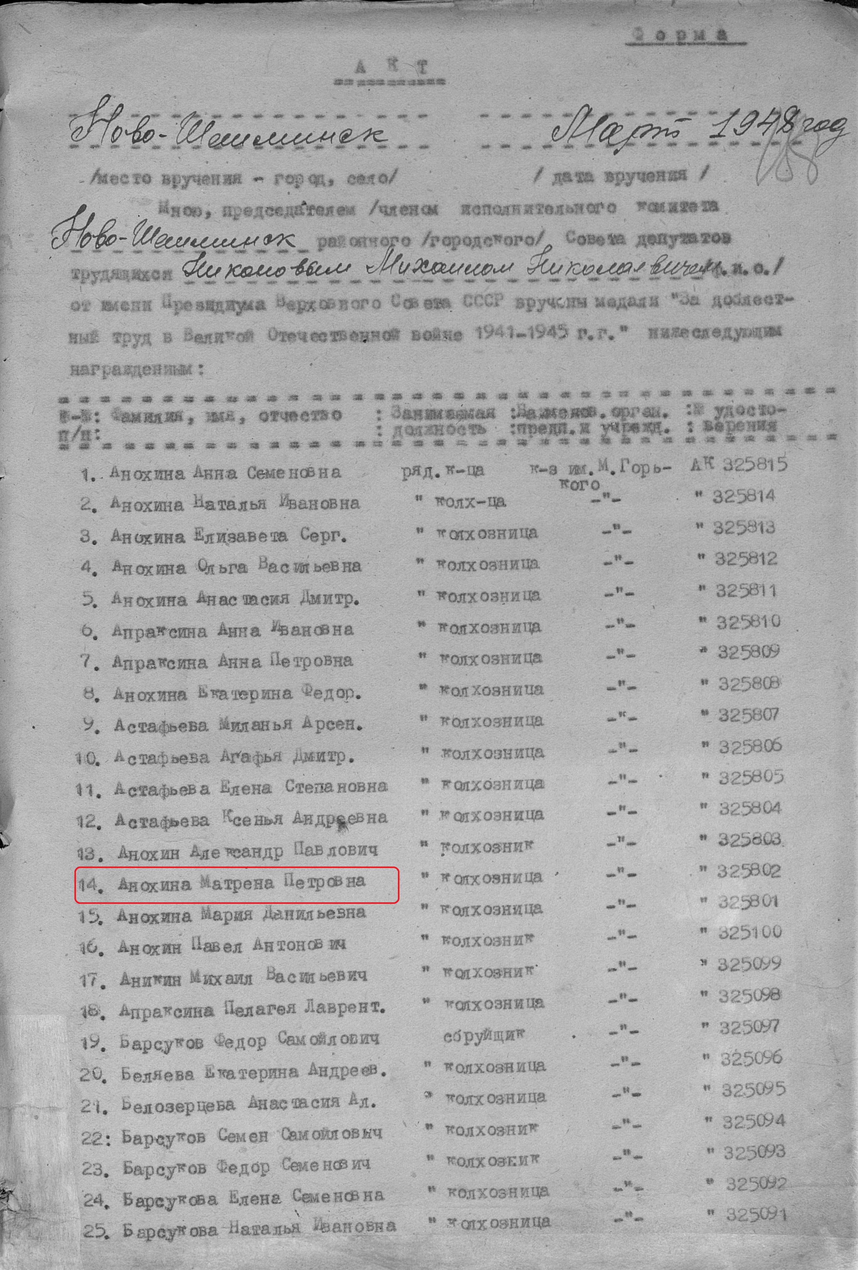 Анохина Матрена Петровна родилась в 1898 году. Место жительства: с.Сл.Арханегельская Ново-Шешминский район ТАССР. В годы Великой Отечественной войны работала в колхозе им. Горького колхозницей. Награждена медалью "За доблестный труд в Великой Отечественной войне 1941–1945 гг." (Акт от 20 февраля 1946г., Фонд 3610, опись 2, дело № 470, лист 188, №325802).