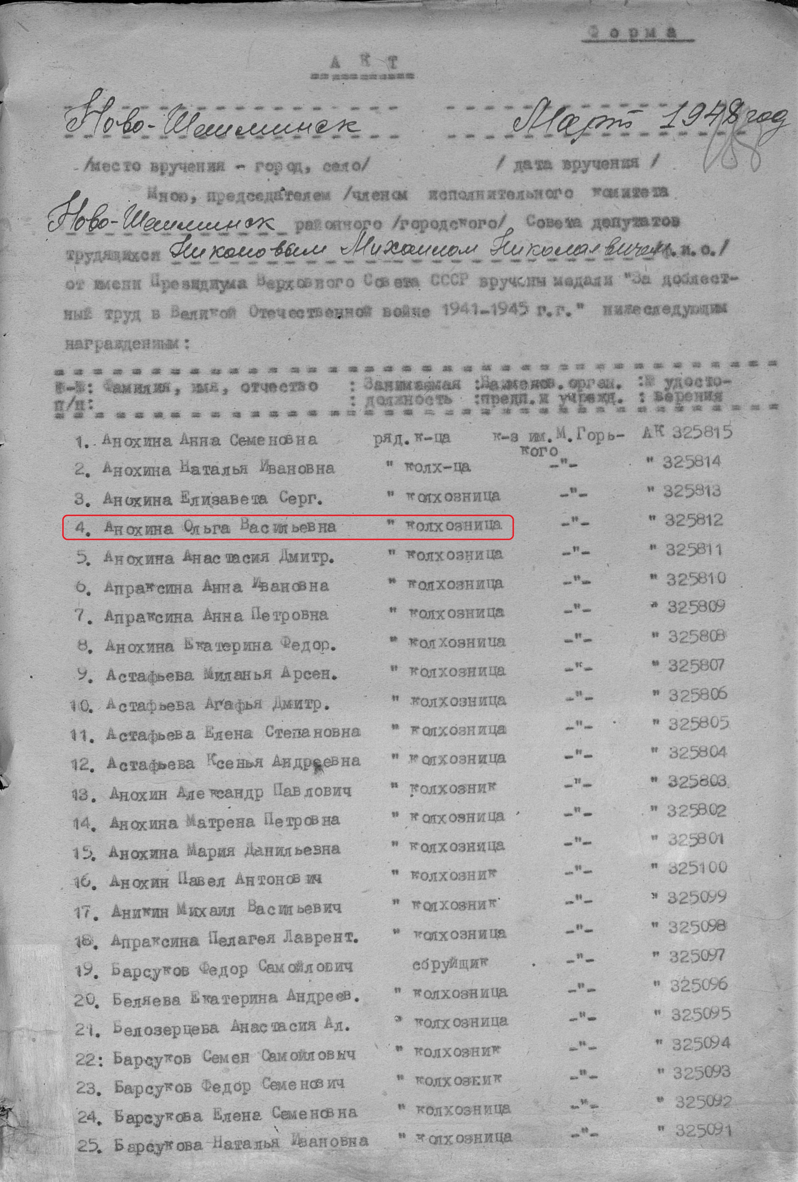 Анохина Ольга Васильевна родилась в 1908 году. Место жительства: с.Сл.Арханегельская Ново-Шешминский район ТАССР. В годы Великой Отечественной войны работала в колхозе им. Горького колхозницей. Награждена медалью "За доблестный труд в Великой Отечественной войне 1941–1945 гг." (Акт от 20 февраля 1946г., Фонд 3610, опись 2, дело № 470, лист 188, №325812). Похоронена на сельском кладбище с.Сл.Арханегельская.