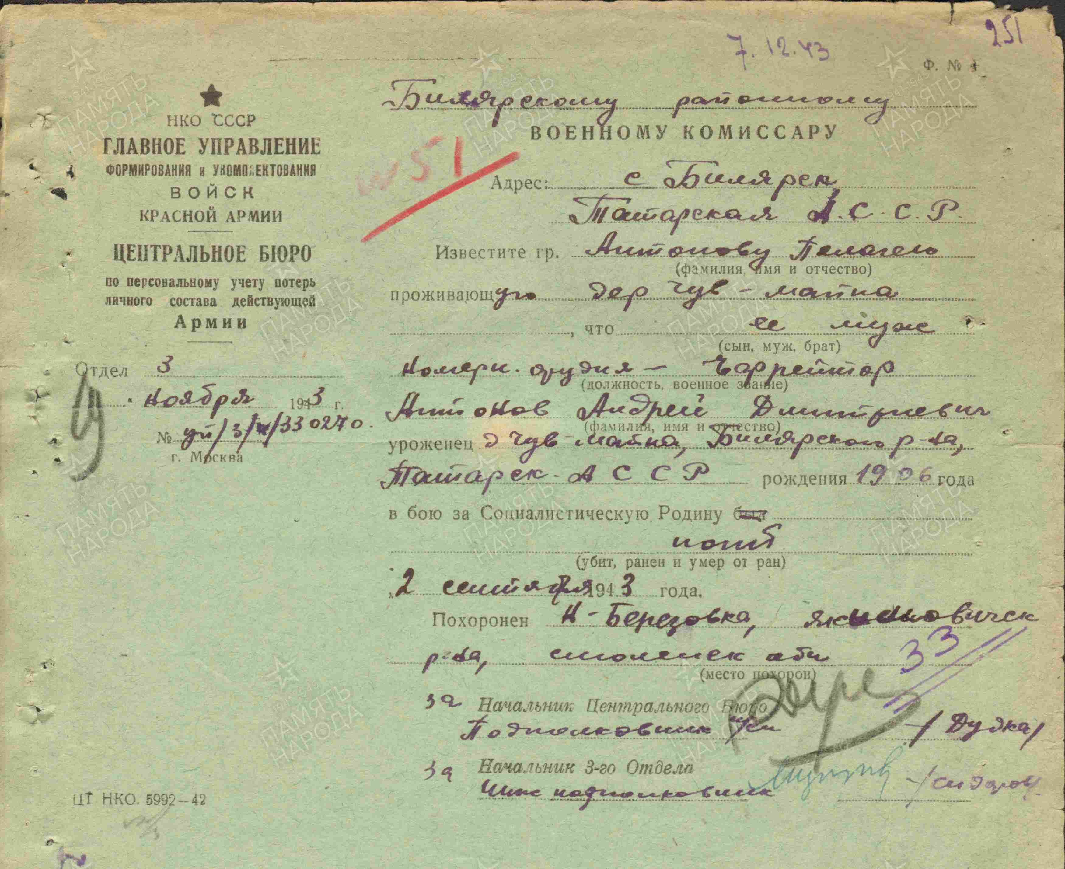 АНТОНОВ Андрей Дмитриевич, 1906, с. Чувашская Майна. Мобилизован Билярским РВК. Ефрейтор, орудийный номер 472 АП 42 СД 49 и 33 А Западного фронта. Погиб 2 сент. 1943, д. Ново-Берёзовка, Екимовичский (Рославльский) р-н, Смоленская обл. Увековечен в п. Екимовичи.