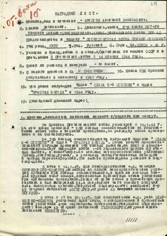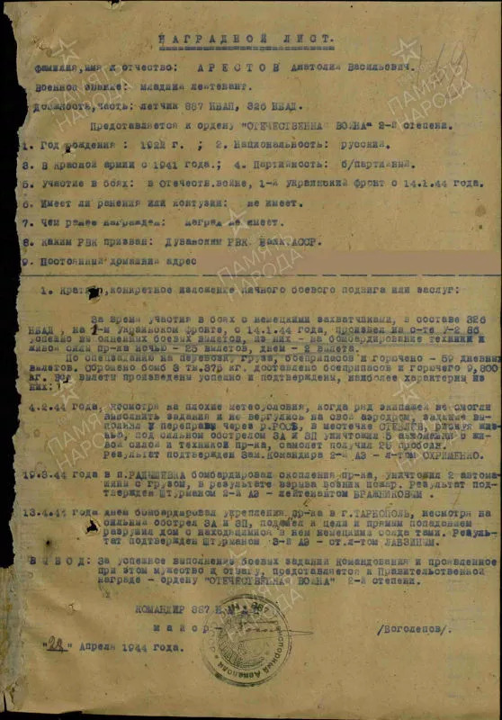 «…Находясь на 1-м Украинском фронте в составе 887 НББАП с января 1944 года совершил 218 вылетов, из них на бомбардирование 107 вылетов. По доставке боеприпасов -111 влетов. За успешное выполнение боевых заданий командования, за совершение 86 вылетов награжден орденом Красная Звезда, после чего с 1.5.44. совершил 132 боевых вылета, из них на бомбардирование техники и живой силы противника 78 вылетов и 54 вылета по доставке боеприпасов. Все вылеты выполнены успешно и подтверждены. Из них наиболее характерны: