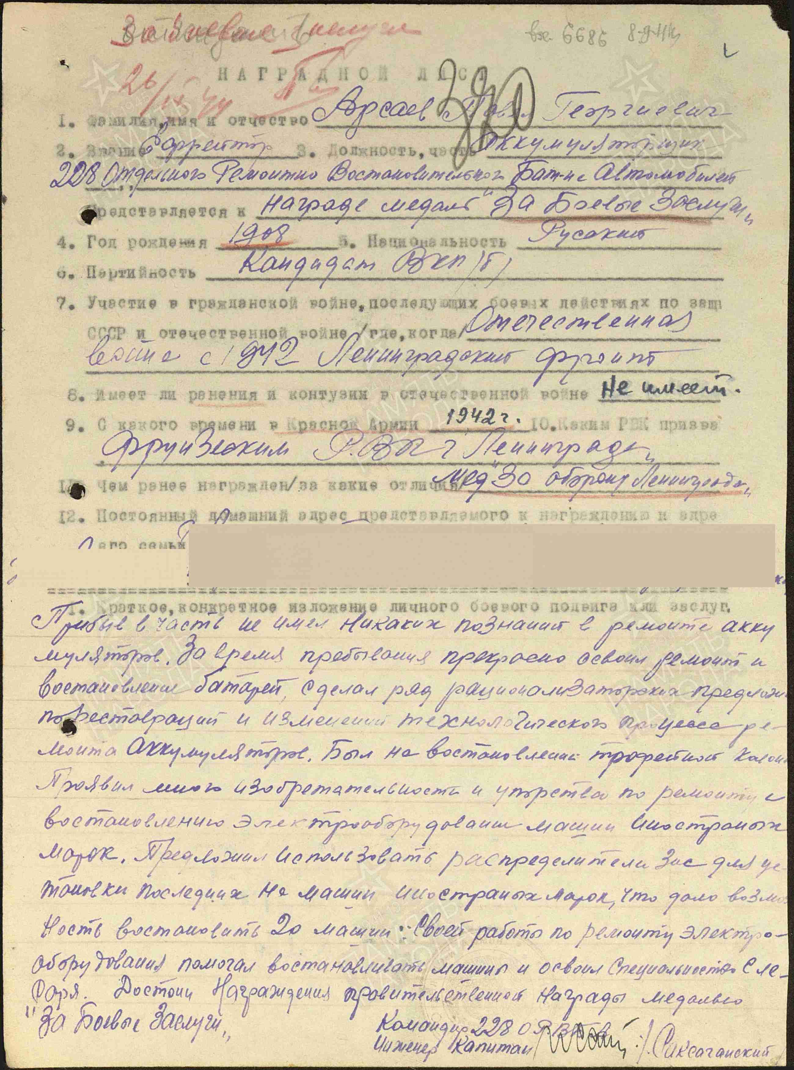 АРСАЕВ Павел Георгиевич, 1908, с. Алексеевское. Мобилизован Фрунзенским РВК г. Ленинград 14 мая 1942. Мл. сержант, слесарь-монтажник 2 отдельного ремонтно-восстановительного батальона, аккумуляторщик 228 отд. рем.-восст. бат. автомобилей 42 Армии ЛенингрФ. Награждён медалями «За оборону Ленинграда», «За боевые заслуги».